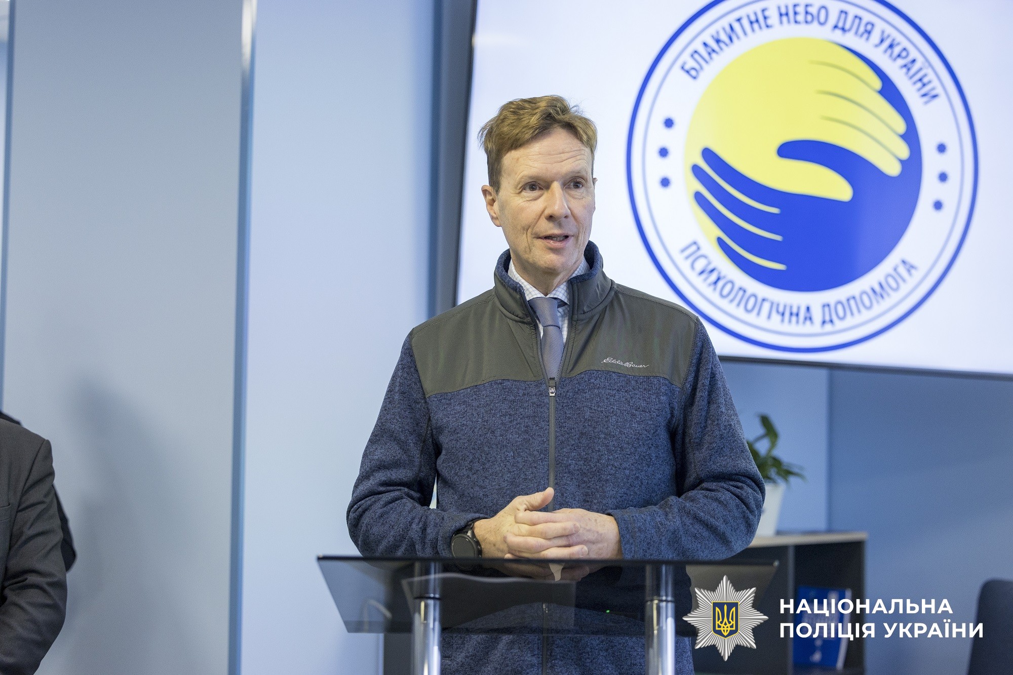Звертаючись до міжнародних партнерів Іван Вигівський зазначив, що відкриття центру ментального відновлення та соціальної підтримки поліцейських є символічним, адже три роки тому 13 січня було створено Об’єднану штурмову бригаду Національної поліції «Лють». Він додав, тому саме цей проєкт «Блакитне небо для України» - це про підтримку і допомогу тим поліцейським.