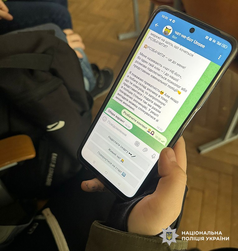 Крім цього, співробітники поліції ознайомили учнів з чат-не-ботом «Unsee», де вони матимуть змогу отримати допомогу, в разі якщо натраплять на шкідливий контент, анонімно проконсультуватись та відчути підтримку. Також дітям надали рекомендації щодо користування даним застосунком.