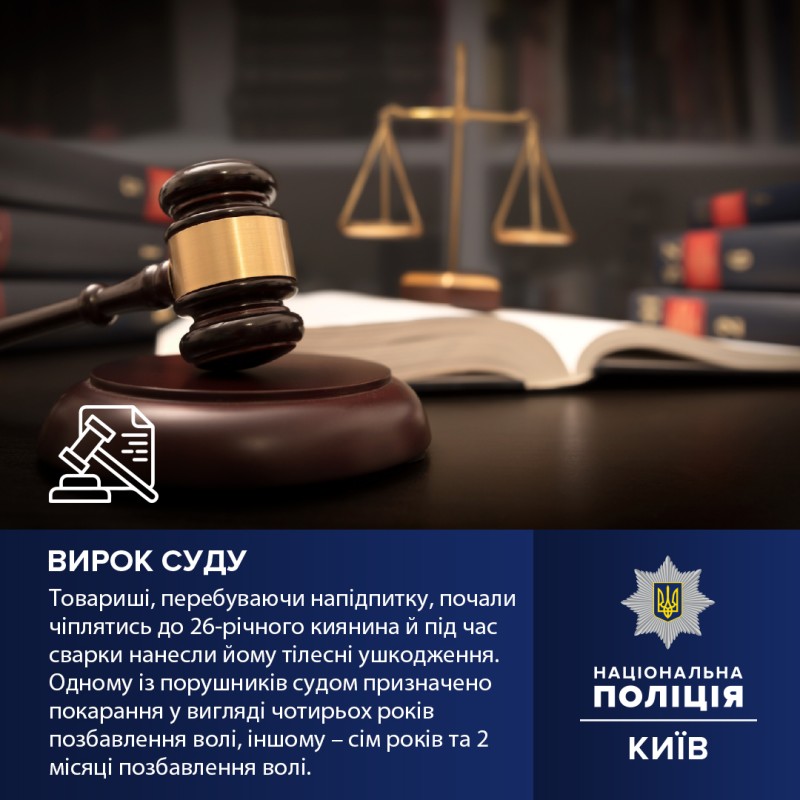 Днями за скоєння кримінального правопорушення Дніпровський районний суд столиці оголосив одному із порушників вирок у вигляді чотирьох років позбавлення волі, а іншому, який наносив удари дерев’яною табуреткою– сім років та 2 місяці позбавлення волі.