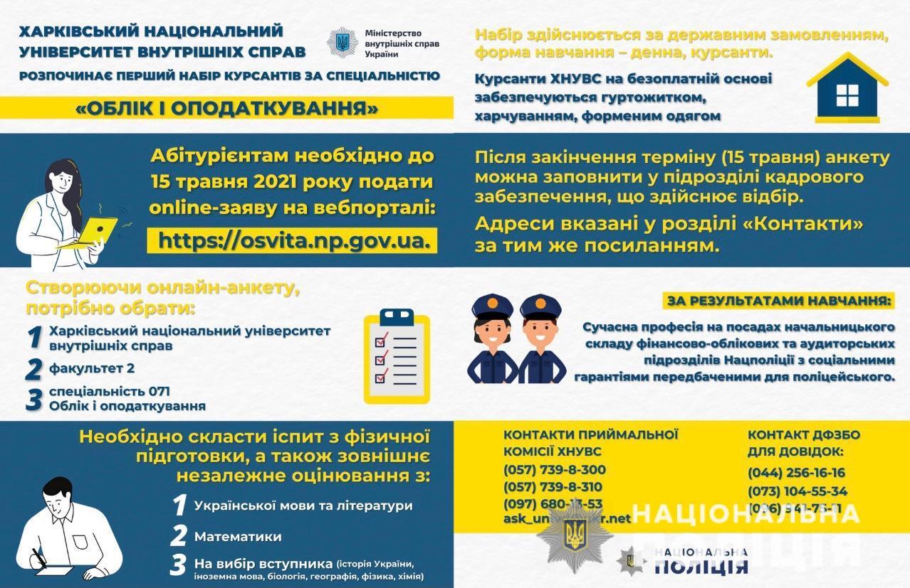 Майбутні курсанти здобудуть освітню кваліфікацію  бакалавр з обліку і оподаткування.  Абітурієнтам необхідно до 15 травня 2021 року подати online заяву на веб-порталі, який призначений для електронної реєстрації кандидатів на навчання у закладах вищої освіти зі специфічними умовами навчання https://osvita.np.gov.ua.