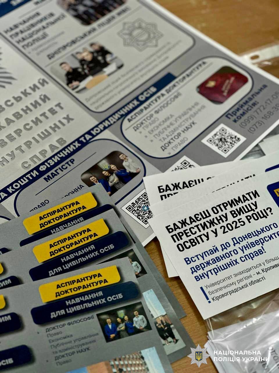 Декан факультету № 1 Ольга Ковальова детально пояснила, чим відрізняється навчання у Донецькому університеті внутрішніх справ, який наразі базується в місті Кропивницькому. Вона акцентувала увагу на перевагах професійної підготовки, яка поєднує теоретичні знання з практичною діяльністю. Поліціянтка також відповіла на запитання учнів про напрямки діяльності поліцейських, кар’єрний зріст та перспективи після випуску.