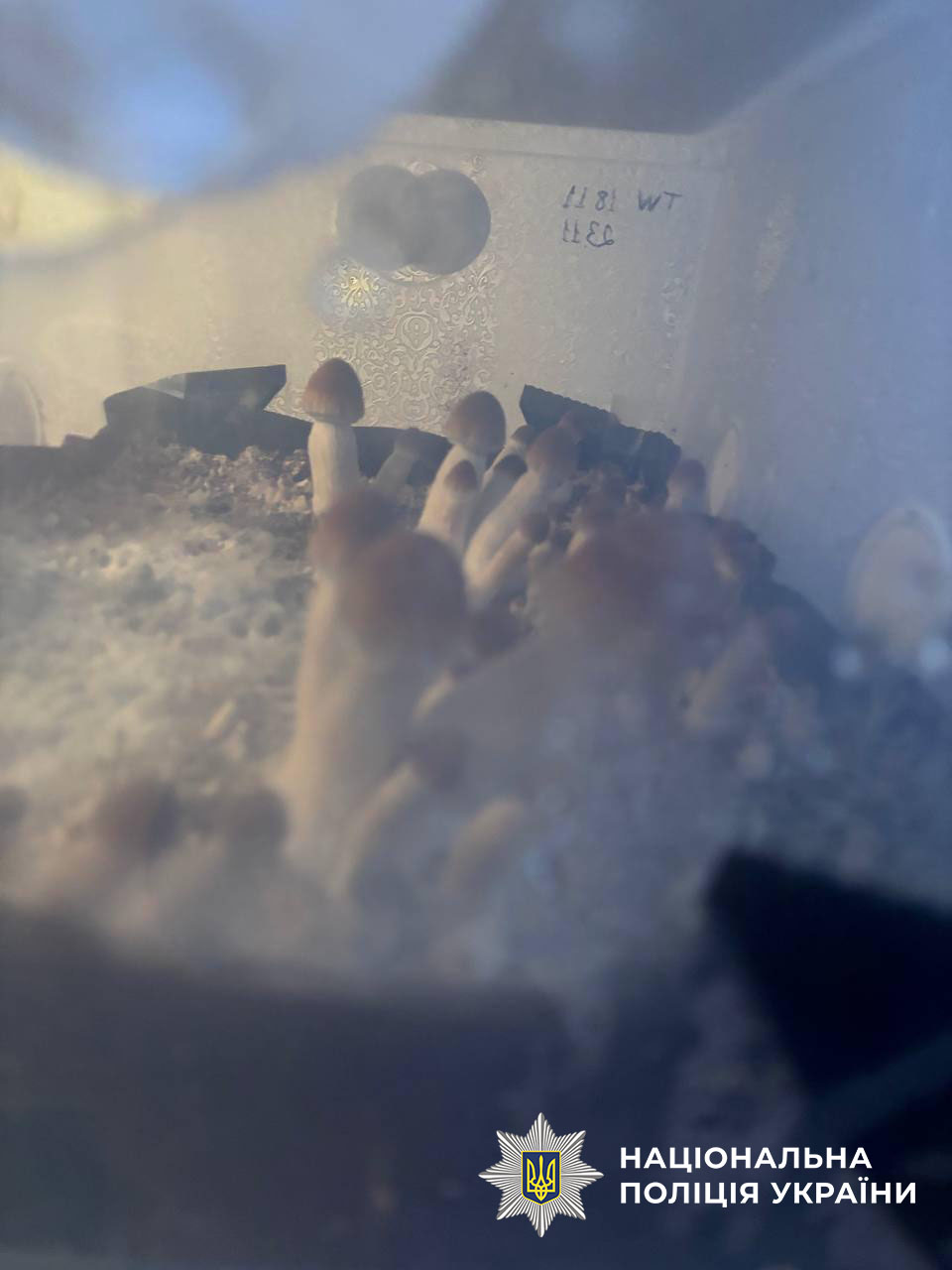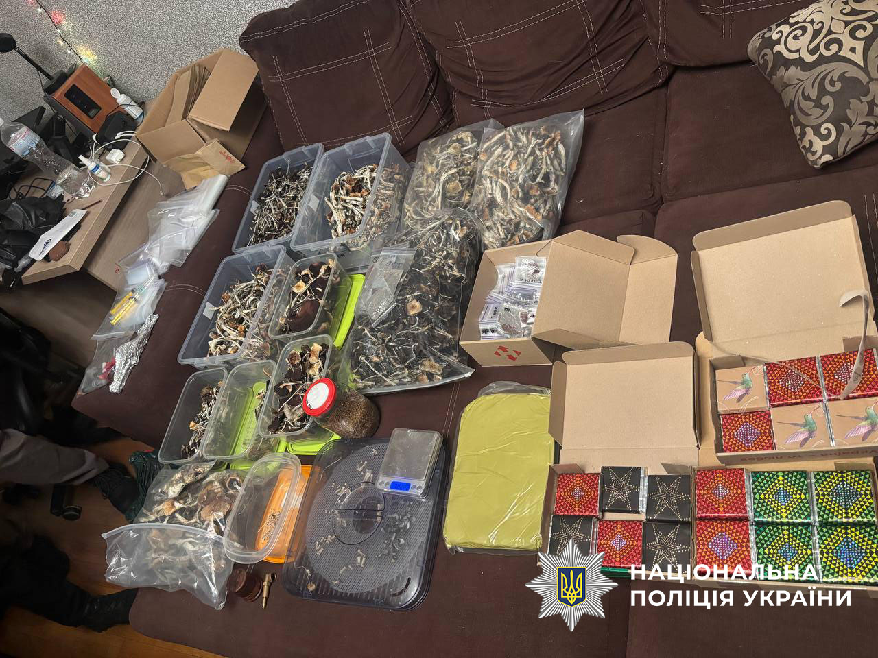 Під час обшуку за місцем проживання чоловіка, поліцейські вилучили плитки шоколаду із вмістом псилоцибінових грибів, гриби в сухому вигляді, контейнери для вирощування грибів, зіп-пакети зі спорами грибів, ємності із вмістом міцелію, зіп-пакети з канабісом, психотропну речовину кратом та гроші, отримані за «товар». За попередніми підрахунками, вартість вилучених речовин за цінами «чорного» ринку складає понад мільйон гривень.