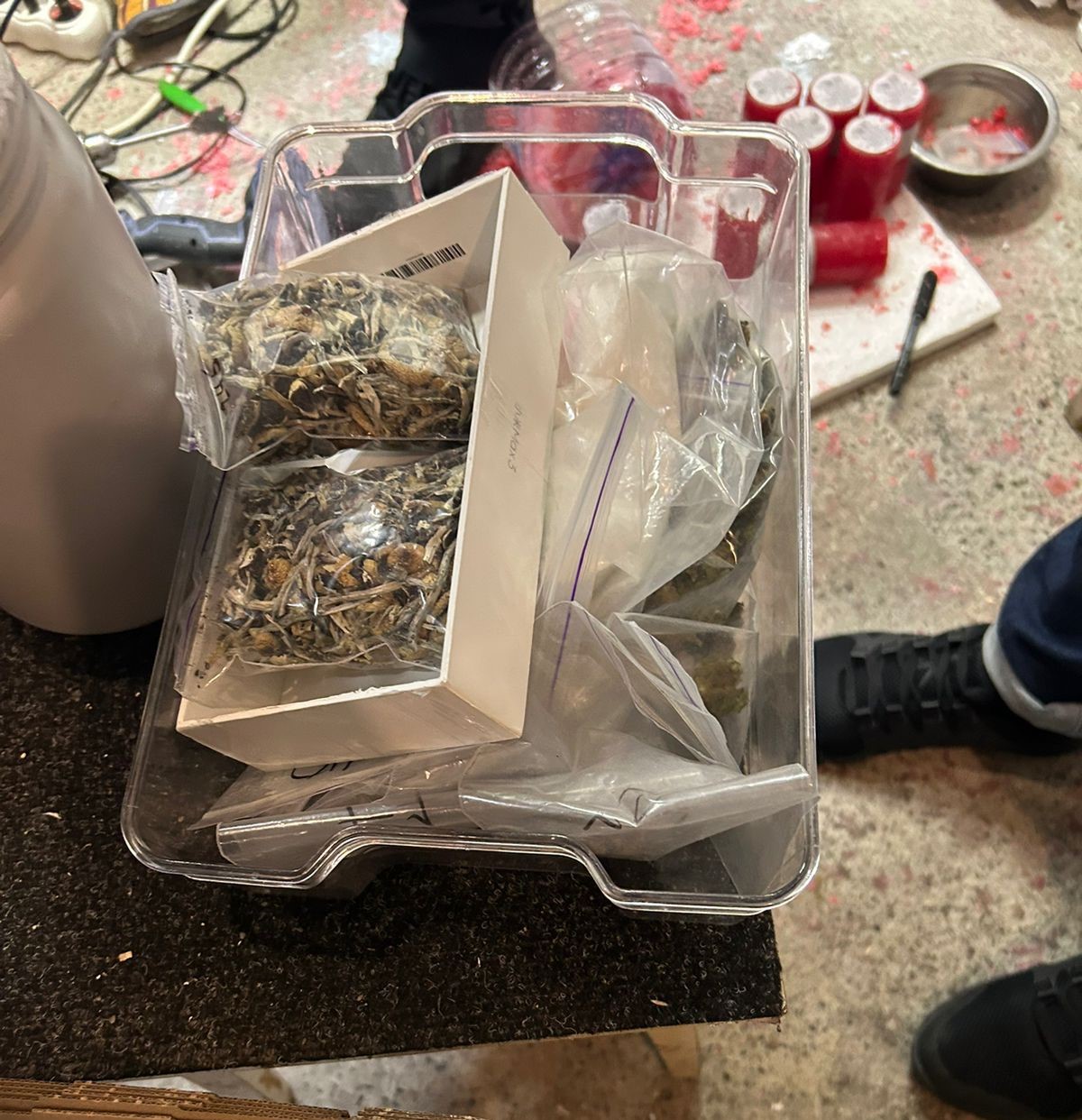 «Ми вилучили у фігуранта 20 згортків із псилоцибіновими грибами, 2 зіп-пакетика із порошкоподібною речовиною, ймовірно, амфетамін та 2 мобільних телефони. Також у гаражному приміщенні ми провели невідкладний обшук, під час якого вилучили електронні ваги з залишками наркотичної речовини, 20 поліетиленових пакетиків з психотропними таблетками, 25 згортків з, ймовірно, солями PVP, 3 зіп-пакети з псилоцибіновими грибами, зіп-пакети з канабісом, товарні накладні, ноутбук та пластиковий контейнер з нашаруванням наркотичної речовини. За цінами «чорного ринку» сума вилучених речовин складає близько 500 000 гривень».