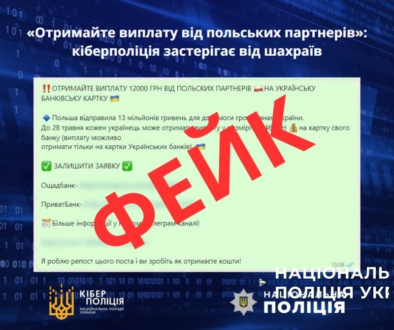 «Отримайте виплату від польських партнерів»: кіберполіція застерігає від шахраїв