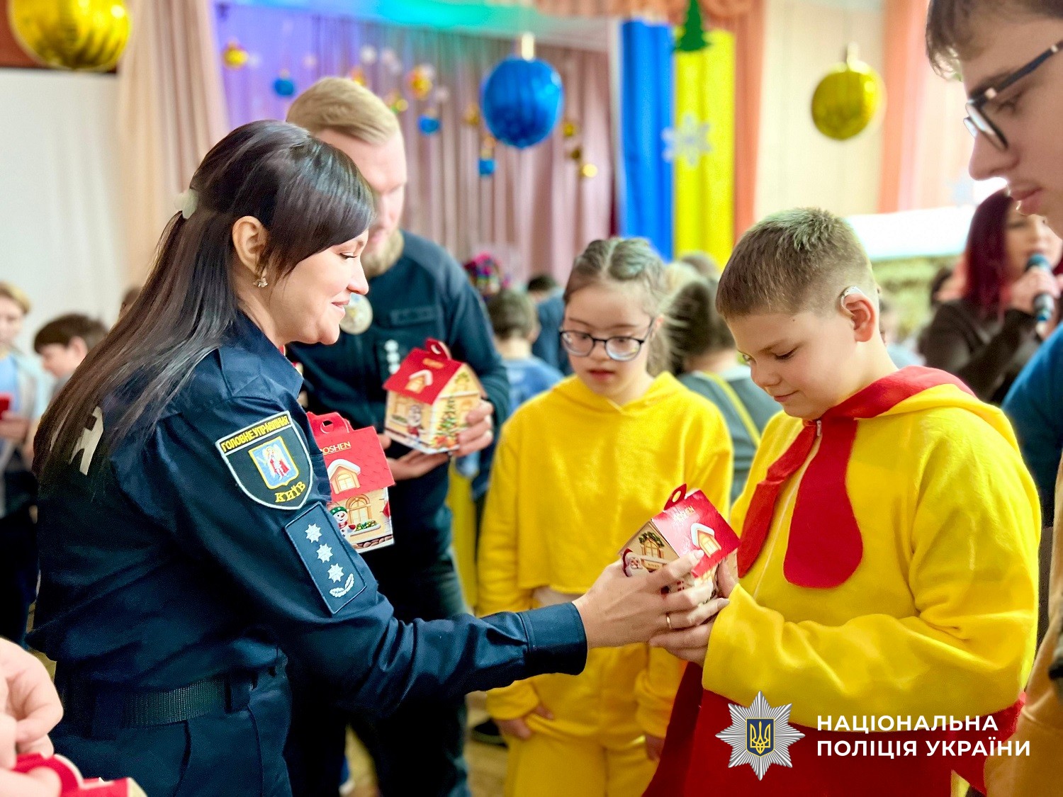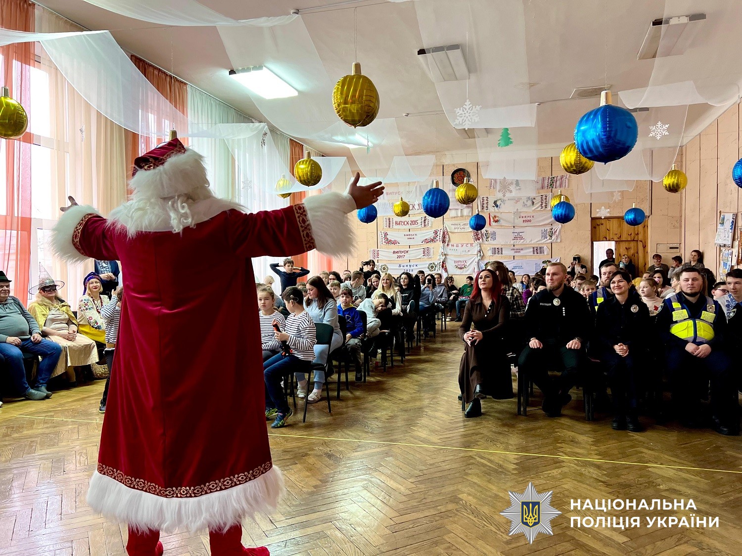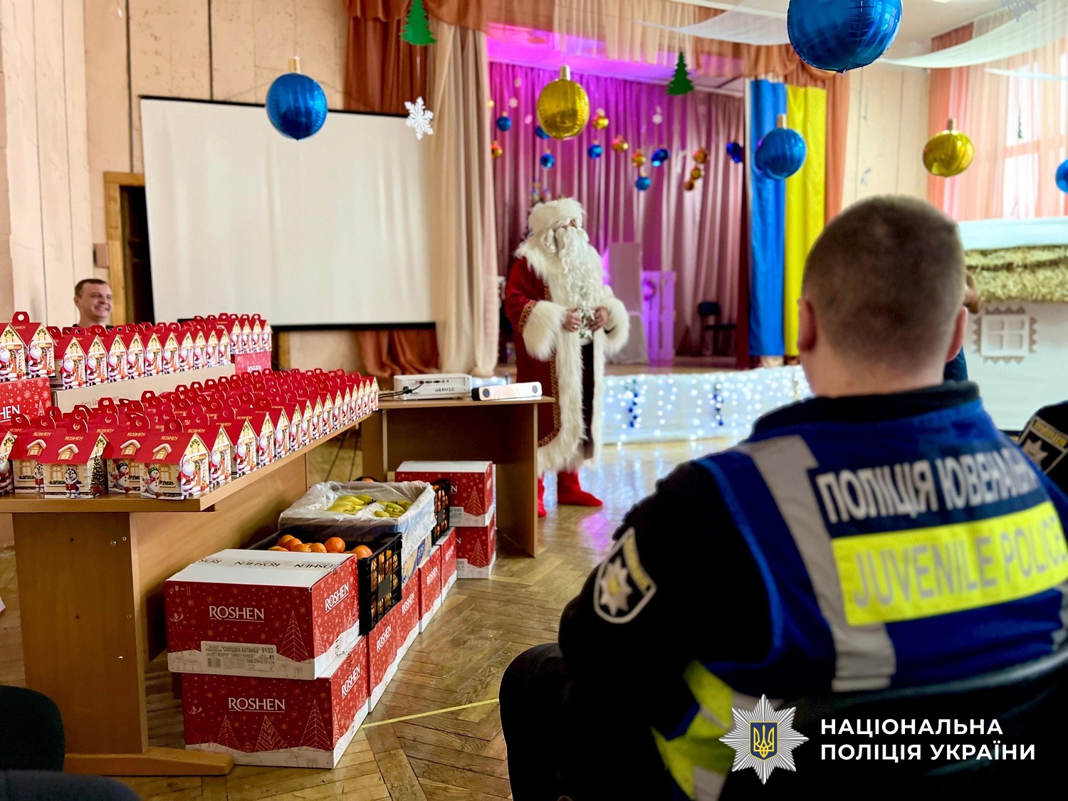 Поліцейські передали хлопцям та дівчатам фрукти й солодощі, побажали міцного здоров’я, сил і натхнення у новому році, а також із задоволенням переглянули святковий концерт, який підготували діти.