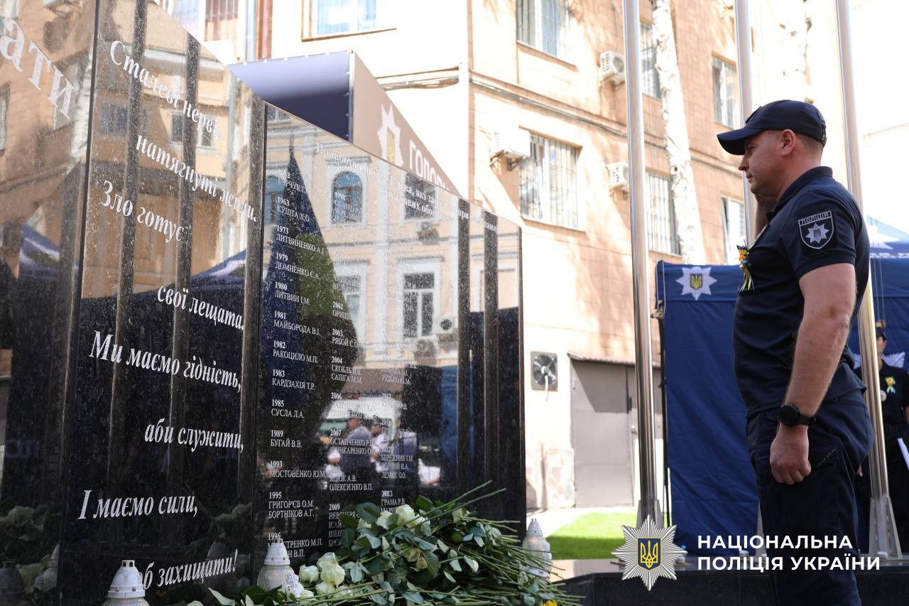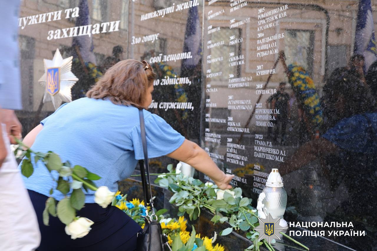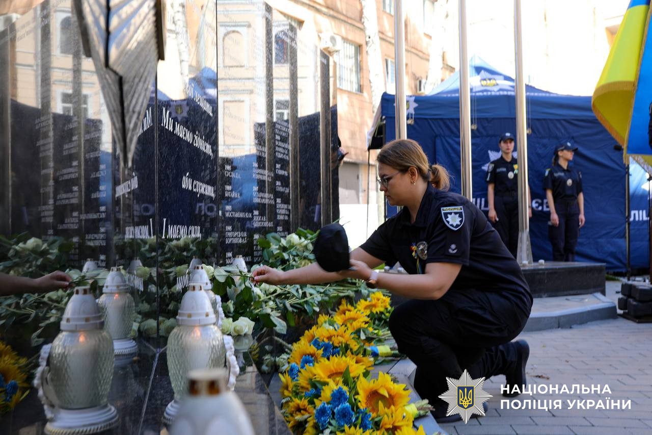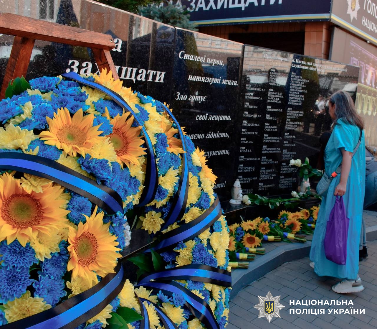 Сьогодні біля меморіалу пам’яті зібралися поліцейські, ветерани органів внутрішніх справ та родини загиблих Героїв. Присутні поклали квіти до пам’ятної стели та вшанували хвилиною мовчання тих, хто ціною власного життя боронив Україну та її народ.
