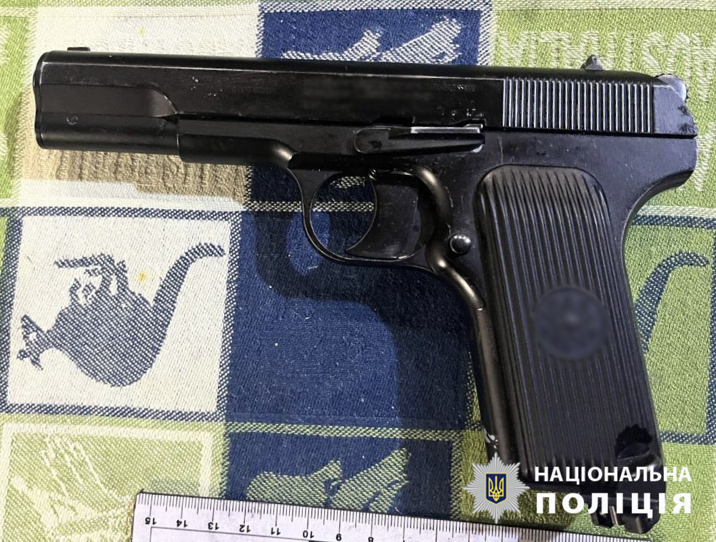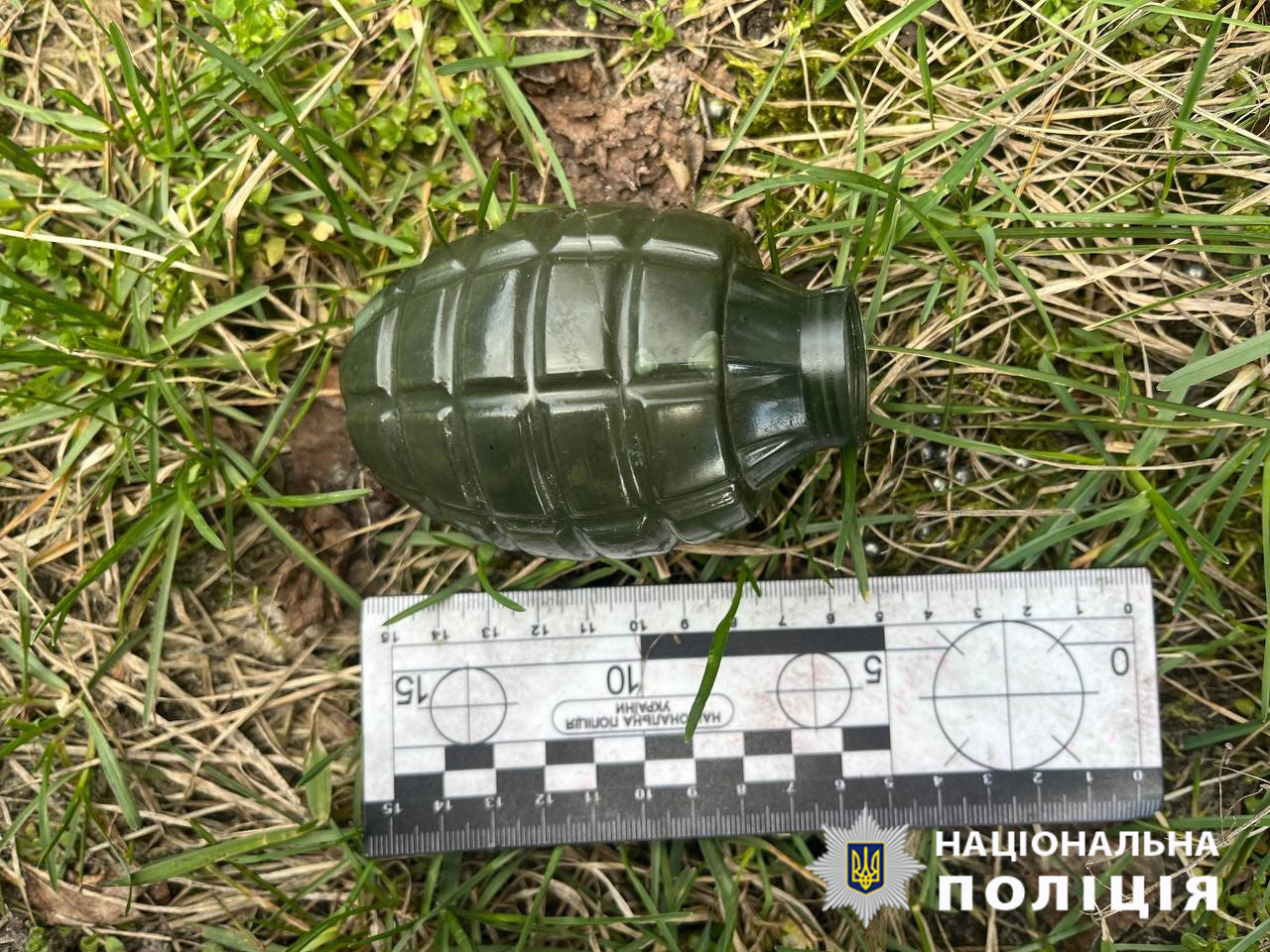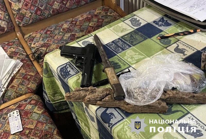 Поліцейські затримали зловмисника у порядку ст. 208 Кримінального процесуального кодексу України та вилучили в нього предмет, схожий на гранату, запал типу УЗРГМ, ніж та пістолет. Вилучені речові докази правоохоронці направили на відповідні експертизи, їх походження та мета зберігання встановлюється.