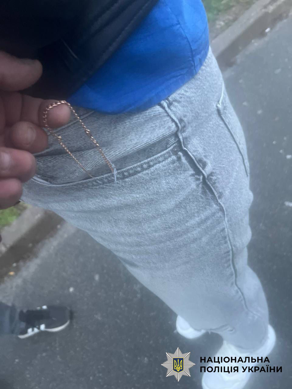 Правоохоронці затримали зловмисницю в порядку статті 208 КПК України одразу після вчинення чергової крадіжки золотого ланцюжка.