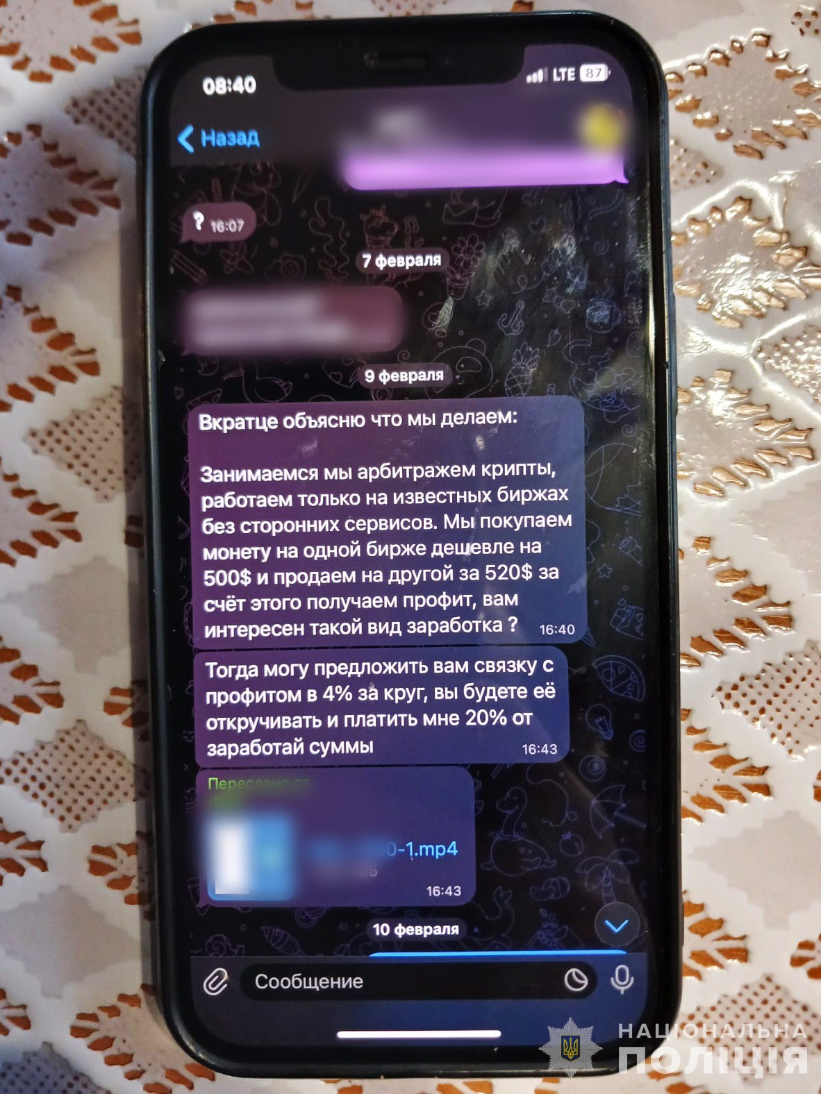 Зловмисники через телеграм-канали розповсюджували оголошення щодо заробітку на криптовалюті та в подальшому переписувались з потенційними жертвами. Для цього вони облаштували на території Київської області діяльність двох call-центрів. Оператори переконували потерпілих перерахувати власні активи на заздалегідь створені фігурантами криптогаманці.