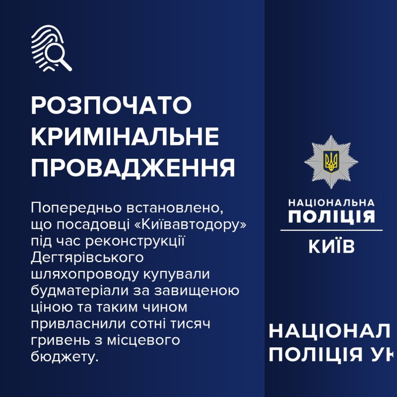 Слідчі столичного главку поліції за оперативного супроводження працівників управління стратегічних розслідувань у м. Києві та за процесуального керівництва Київської міської прокуратури розпочали кримінальне провадження за фактом розкрадання держкоштів на ремонті Дегтярівського шляхопроводу у столиці.