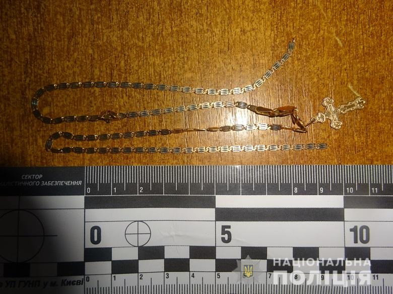 Події трапилися у червні нинішнього року на території Шевченківського району столиці, а потерпілими стали дві жінки. Зловмисник ввечері на вулиці Подвойського звернув увагу на перехожу, у якої на шиї був золотий ланцюжок. Він простежив за нею до під’їзду, після чого підійшов до і зірвав прикрасу.