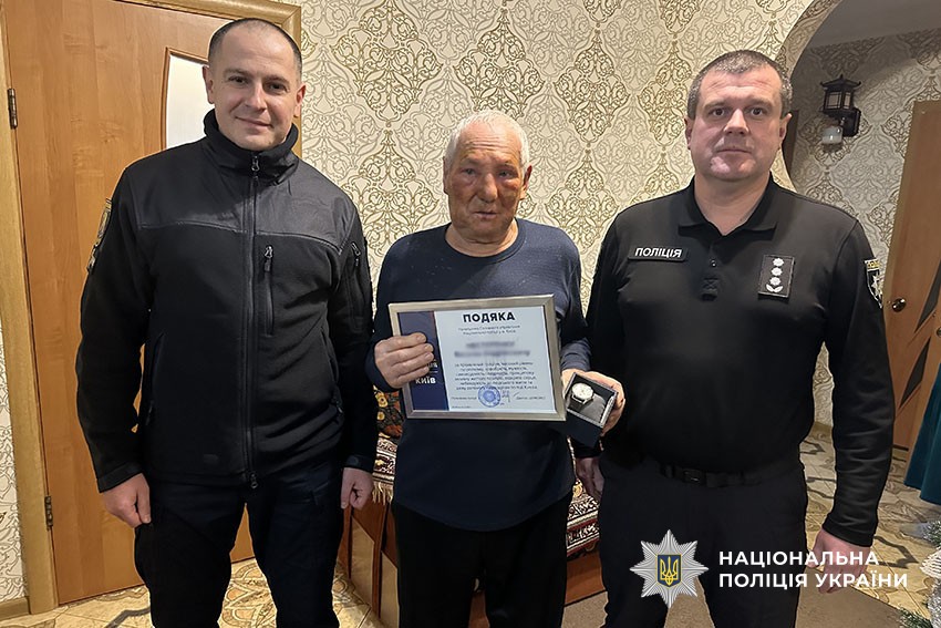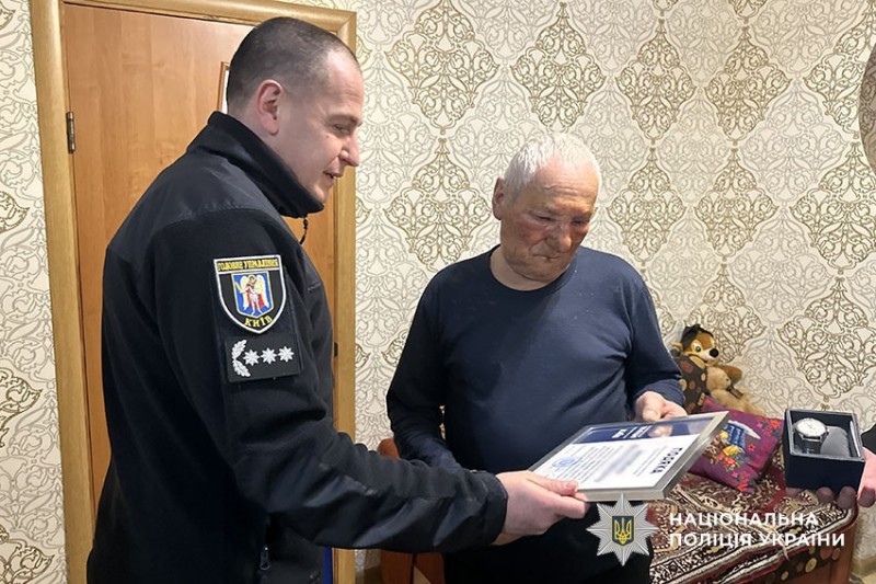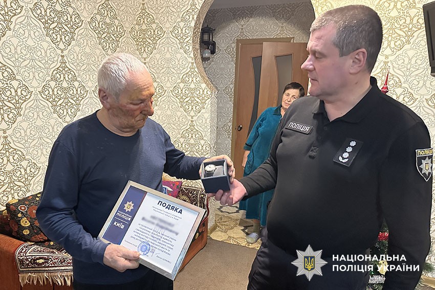 Поліцейські відвідали чоловіка, який мешкає у Святошинькому районі столиці та відзначили сміливця подякою й вручили іменний годинник.
