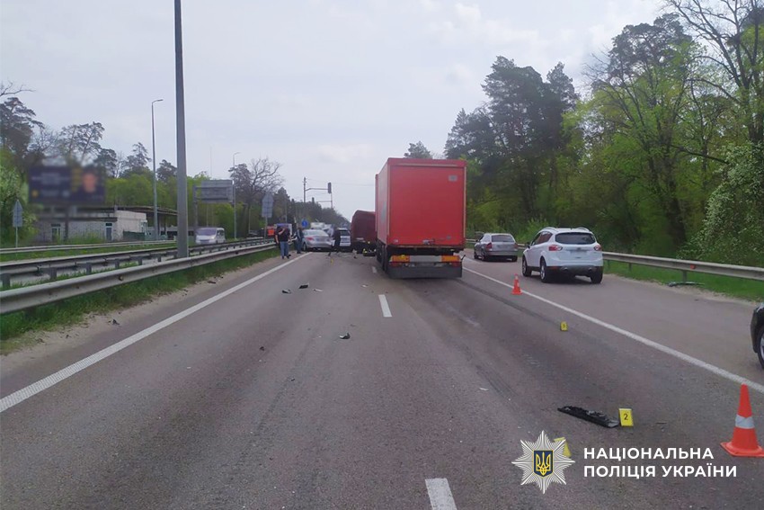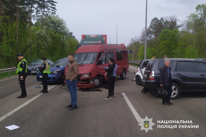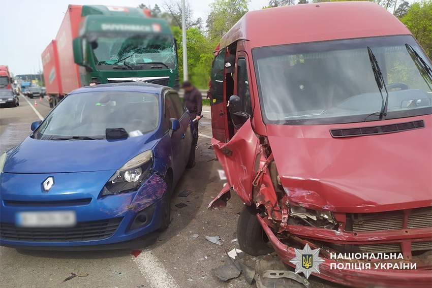 Слідчі з розслідування ДТП столичного главку поліції встановили, що 53-річний керманич вантажівки «MAN» заснув за кермом та здійснив зіткнення із задньою частиною попутного мікроавтобуса «Мерседес Спрінтер». Водій останнього транспортного засобу, в свою чергу, втратив керування та допустив зіткнення із ще чотирма іномарками. Внаслідок зіткнення, постраждали восьмеро пасажирів мікроавтобуса «Мерседес», віком від 26 до 83 років, медики їх госпіталізували до лікарні.