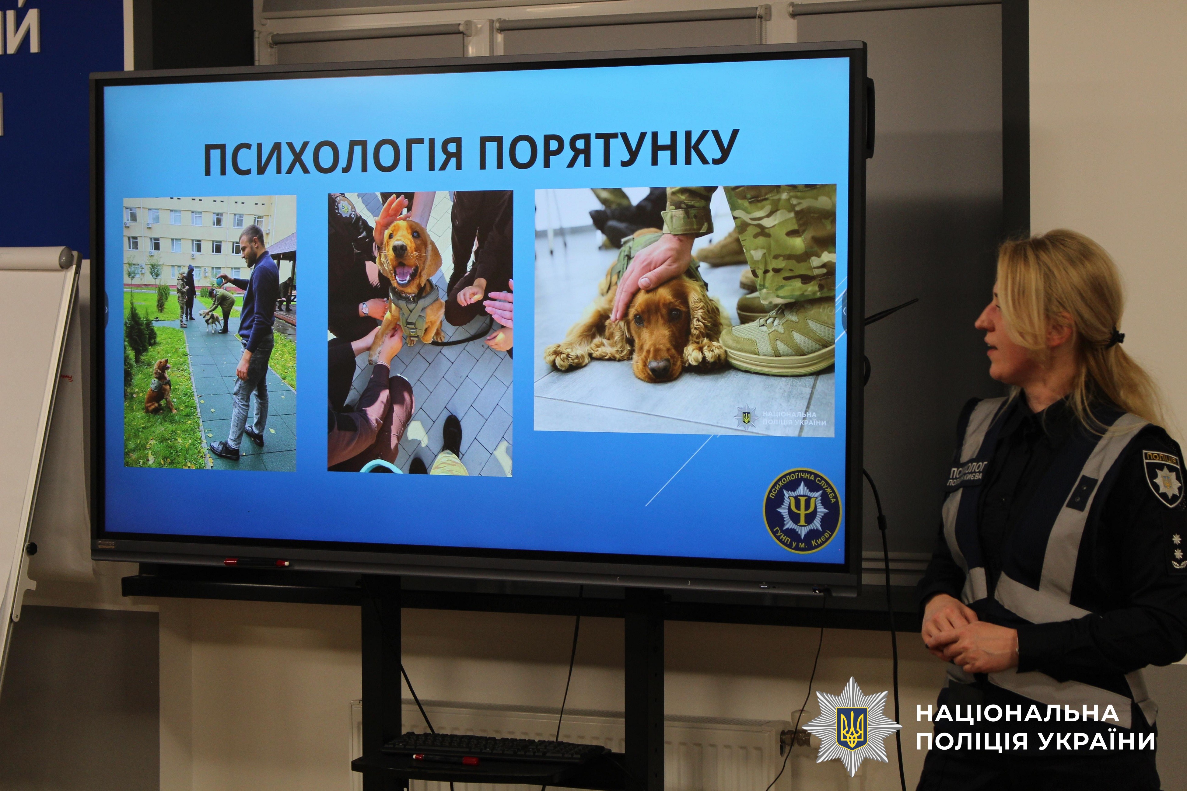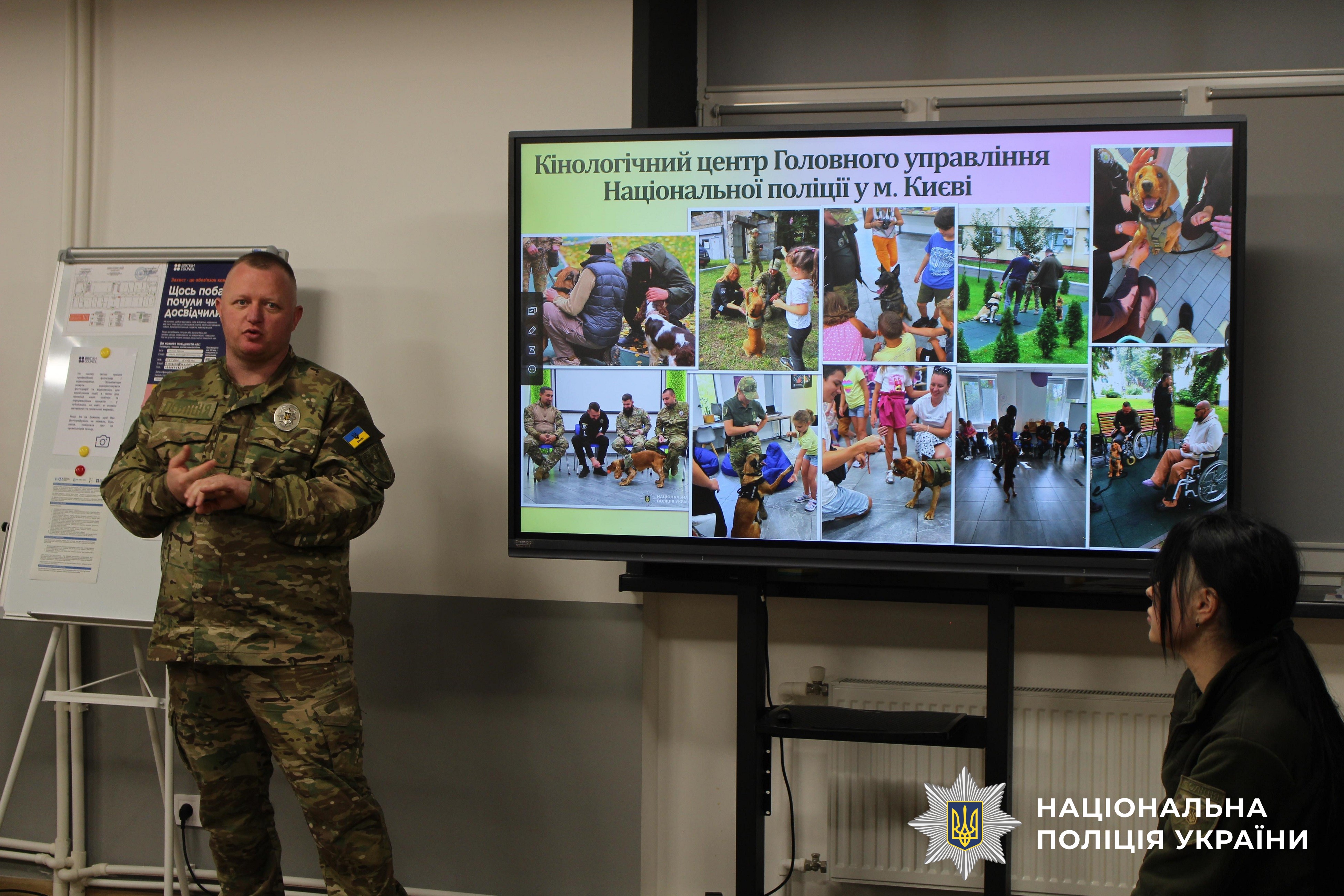 Психологи та кінологи главку поліції Києва продемонстрували вправи, що зазвичай застосовуються у роботі з дітьми та дорослими, які перенесли стресові події. Студенти зізналися, що відчули, як знижується напруга – адже собака вміє зчитувати емоційний стан людини та підтримати без слів.