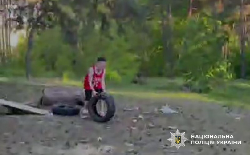Днями у телеграм-каналах поліції Києва поширювалося відео, на якому невідомий хлопець штовхнув шину з автомобільного колеса на чоловіка, який лежав на траві у лісосмузі. Поліцейські встановили «героя» відеоролика та оператора, який зняв відео.