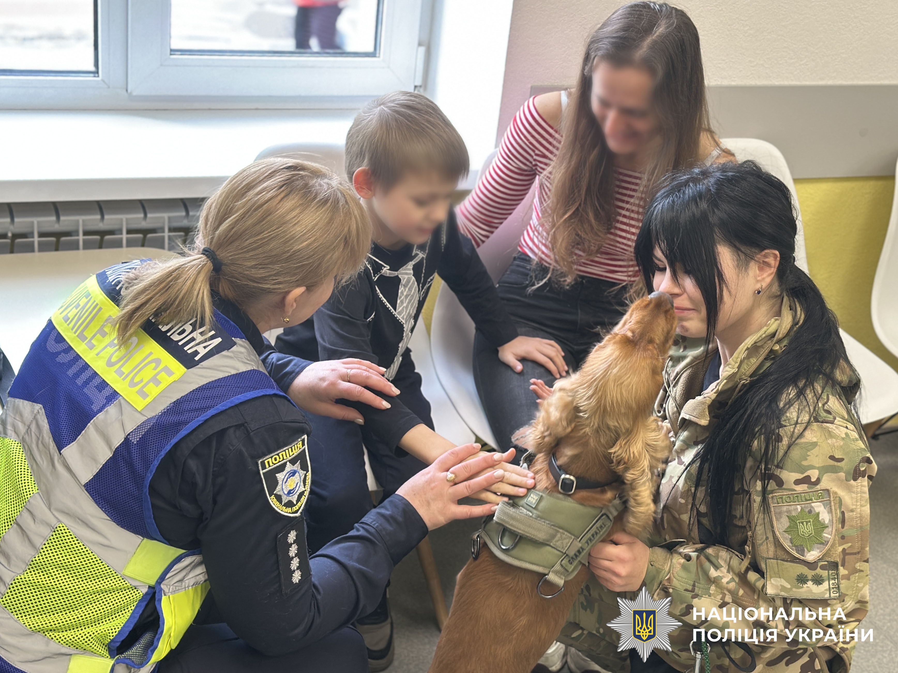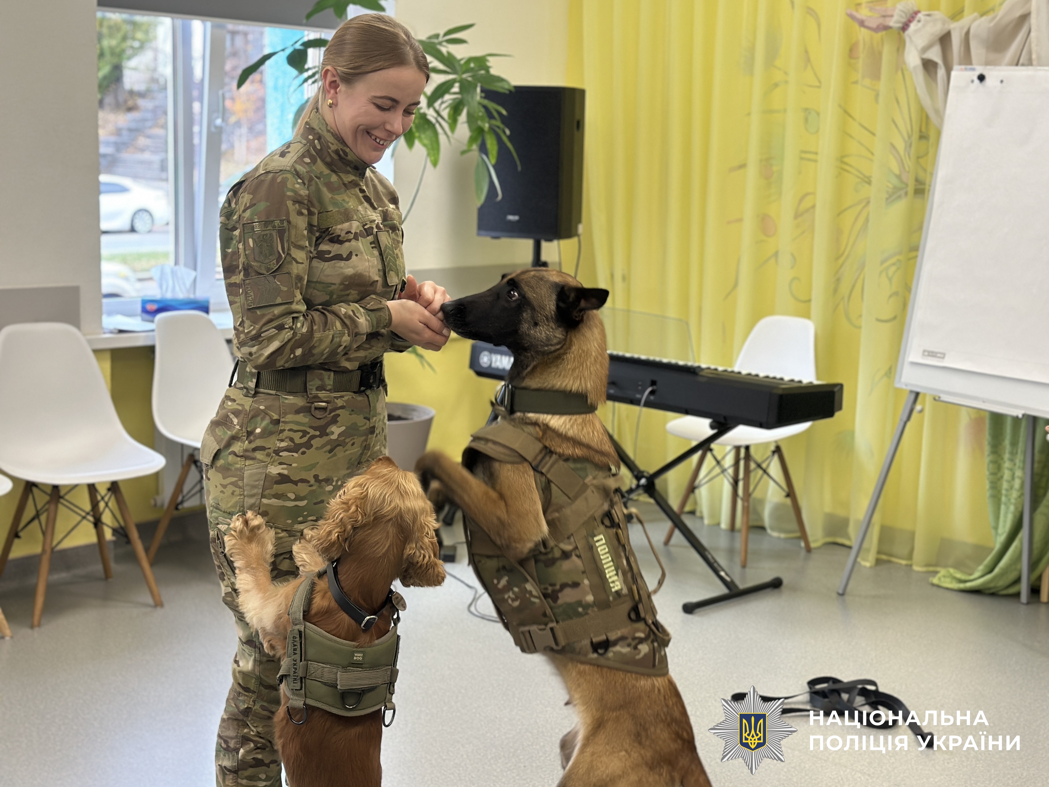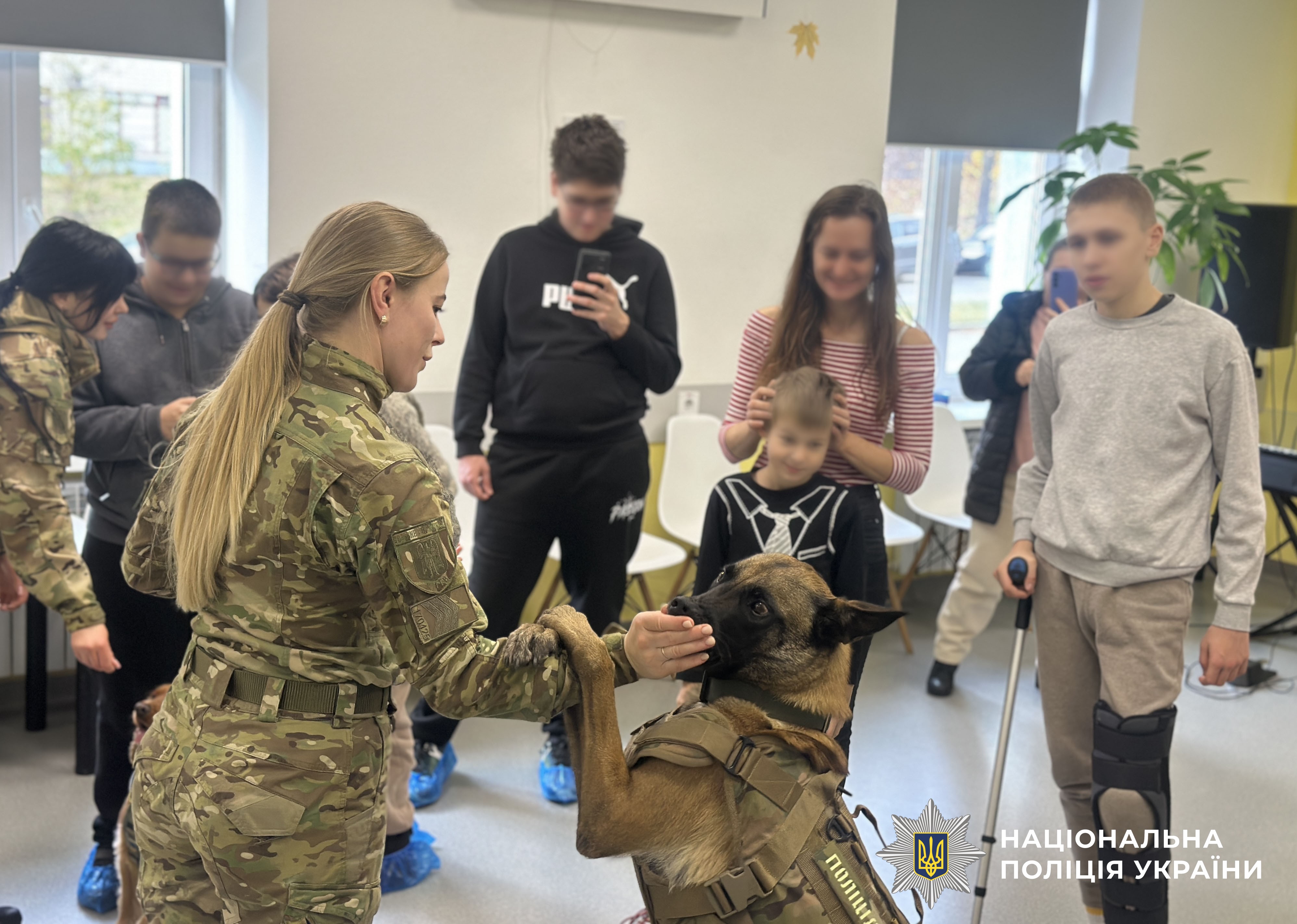 Інспектори ювенальної превенції управління поліції в метрополітені разом з поліцейськими-кінологами завітали до Центру комплексної реабілітації для дітей та молоді з інвалідністю Оболонського району, де організували для його вихованців захопливе дозвілля, яке поєднало пізнання та терапевтичну взаємодію зі службовими собаками.