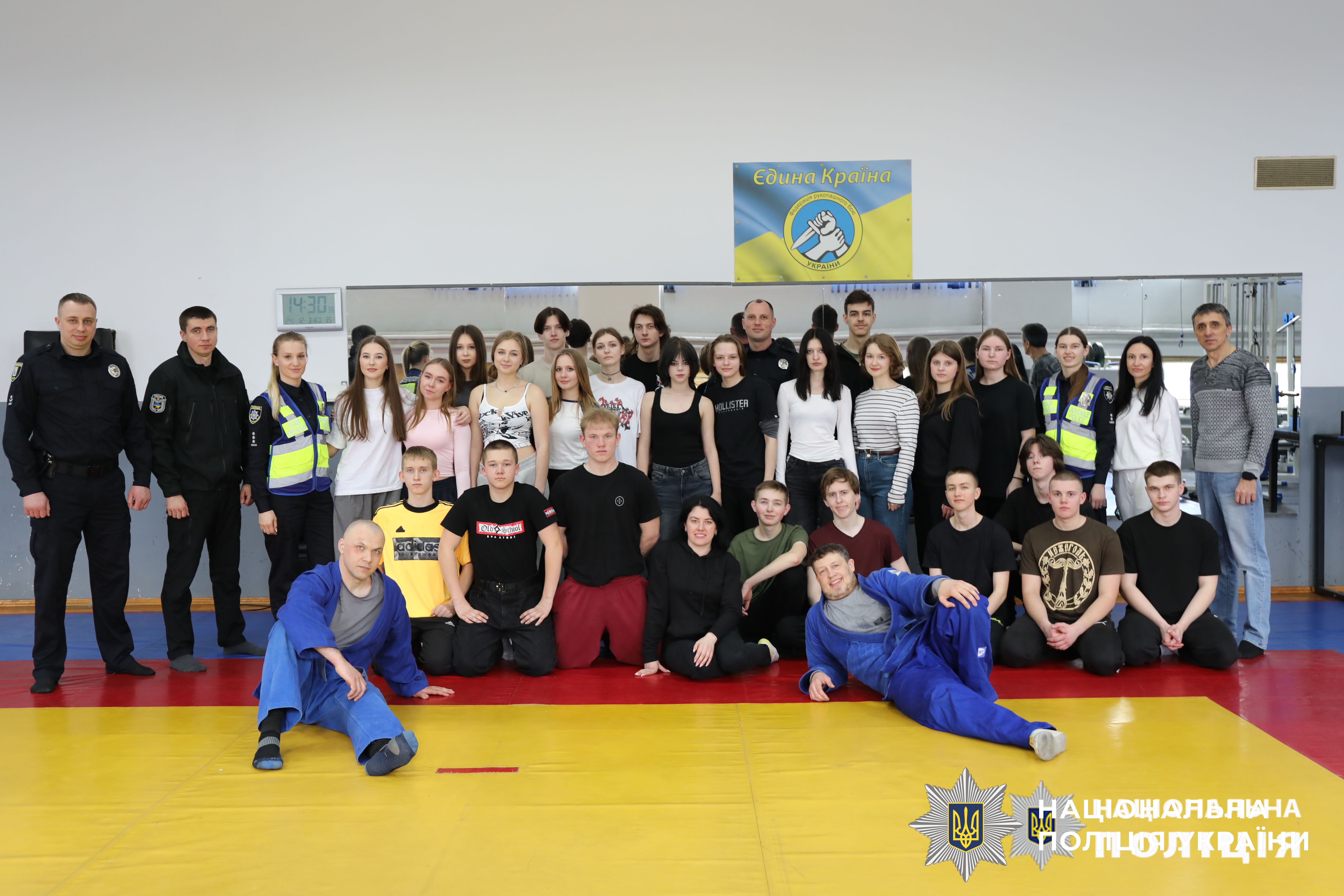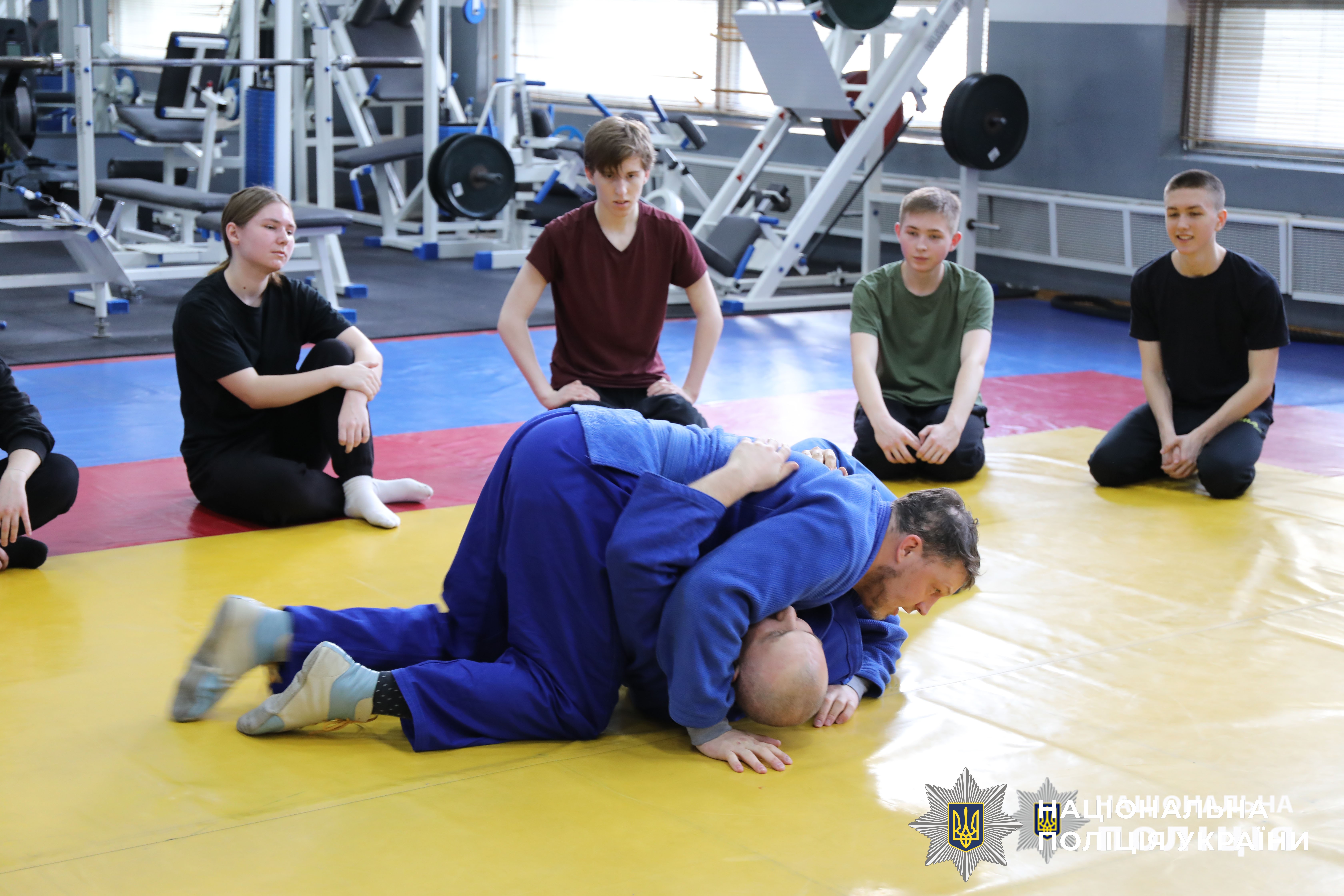 Найбільш цікавою частиною зустрічі було міні заняття з тактико-спеціальної підготовки. Інструктори продемонстрували учням основні прийоми самозахисту та наголосили на важливості якісної фізичної підготовки.