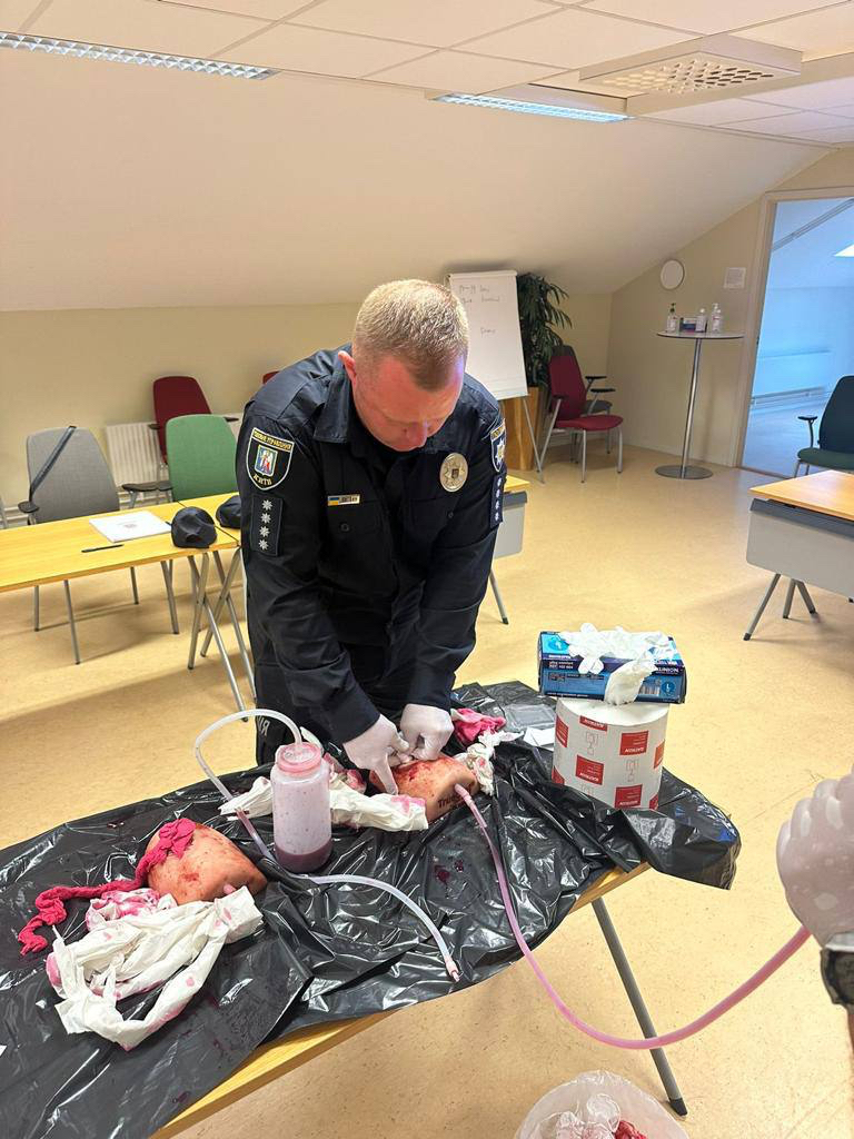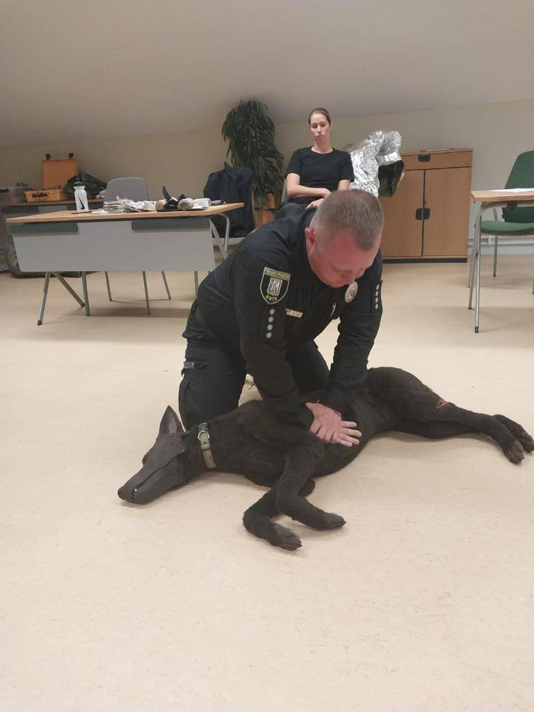 Крім того, поліцейські проходять заняття з вивчення та надання домедичної допомоги для собак в умовах бойових дій. Під час виконання завдань службові собаки можуть отримати порізи чи вогнепальні поранення. Кінологи вчяться швидко реагувати на різні поранення собаки та накладати турнікети, зупиняючи кровотечі аби врятувати життя чотирилапих помічників.