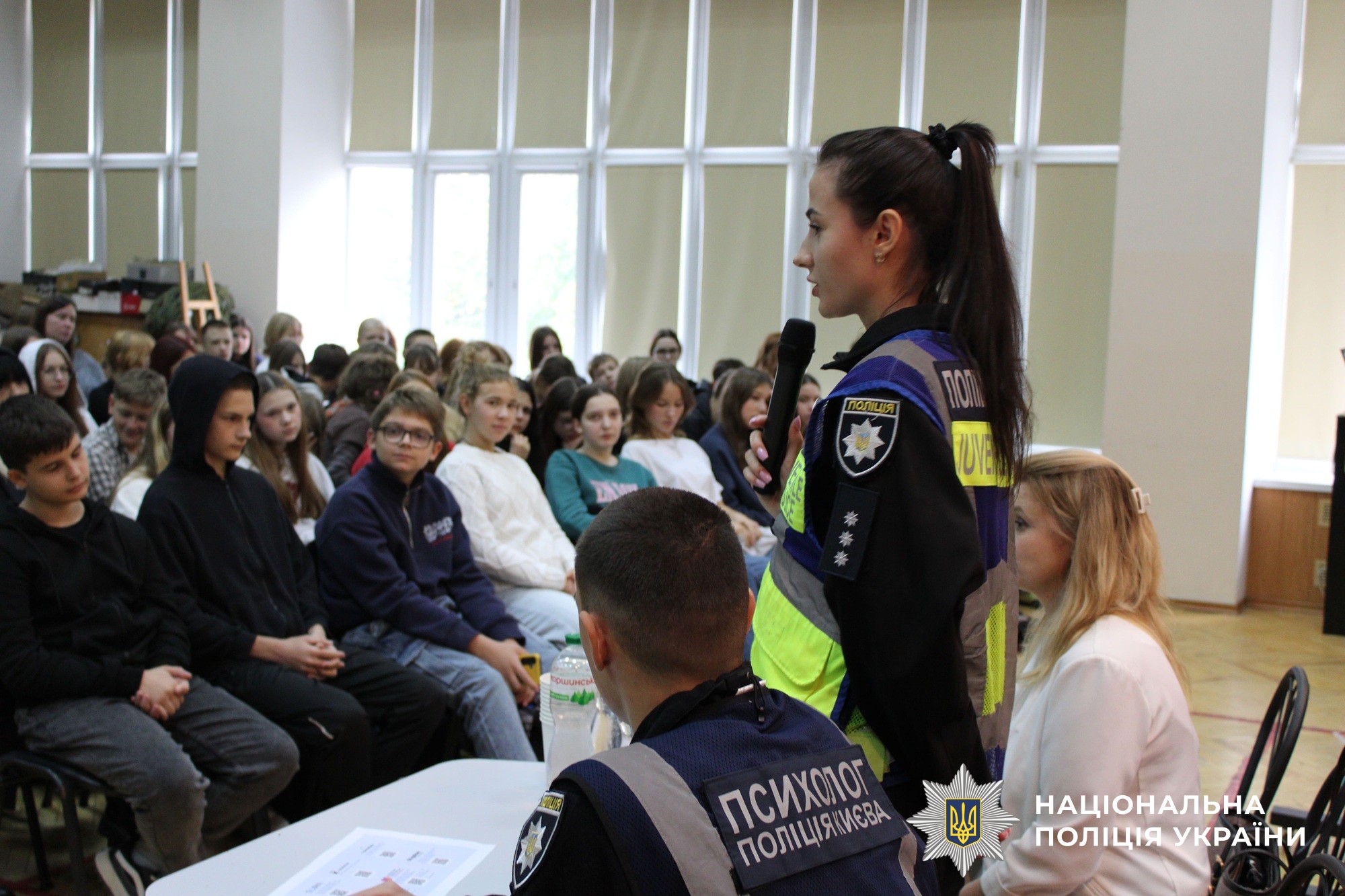 Інспектори ювенальної превенції разом з психологом Дніпровського управління поліції столиці поговорили з учнями про неприпустимість будь-яких проявів насильства та навчали їх правильно діяти у разі цькування.