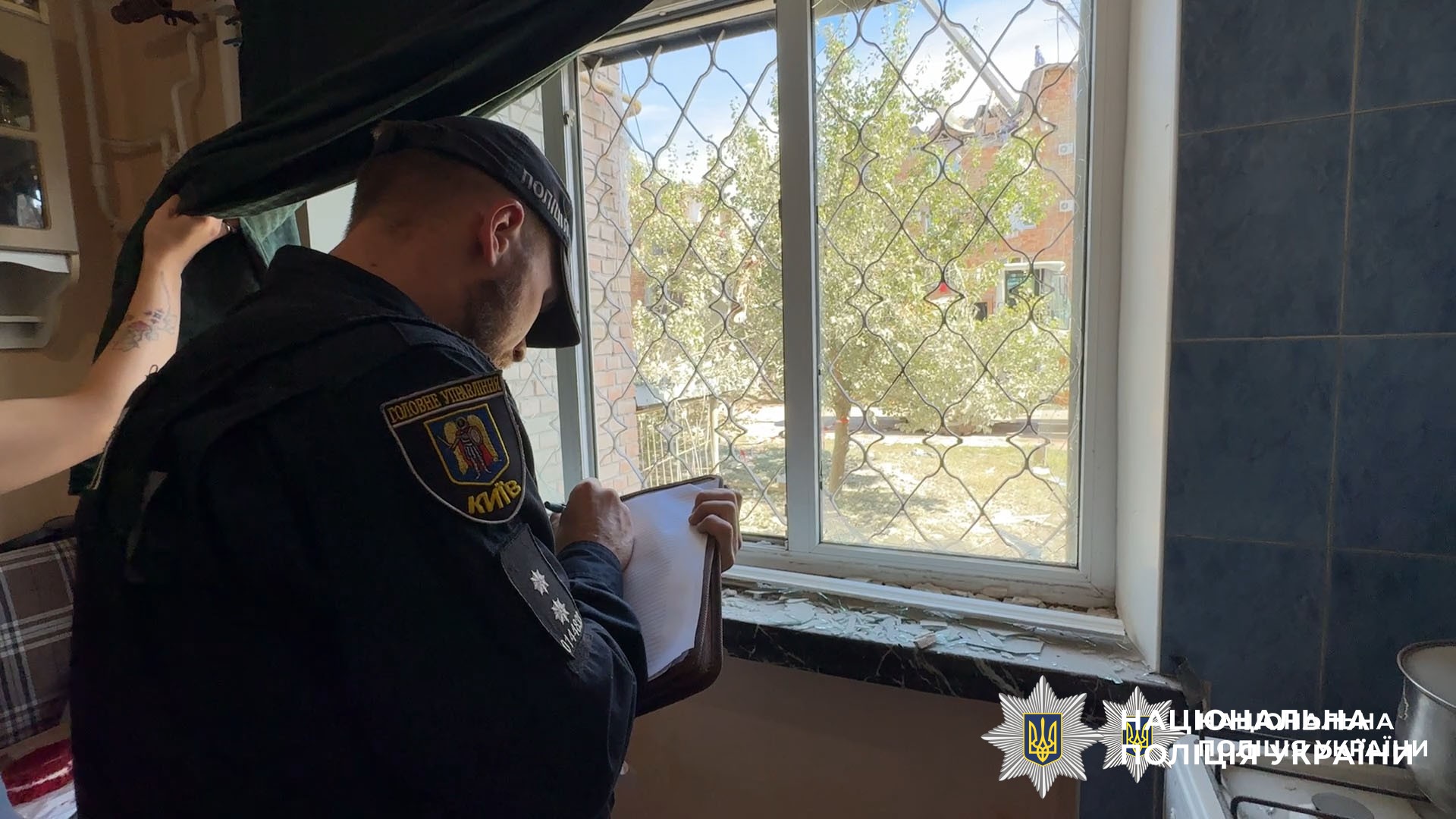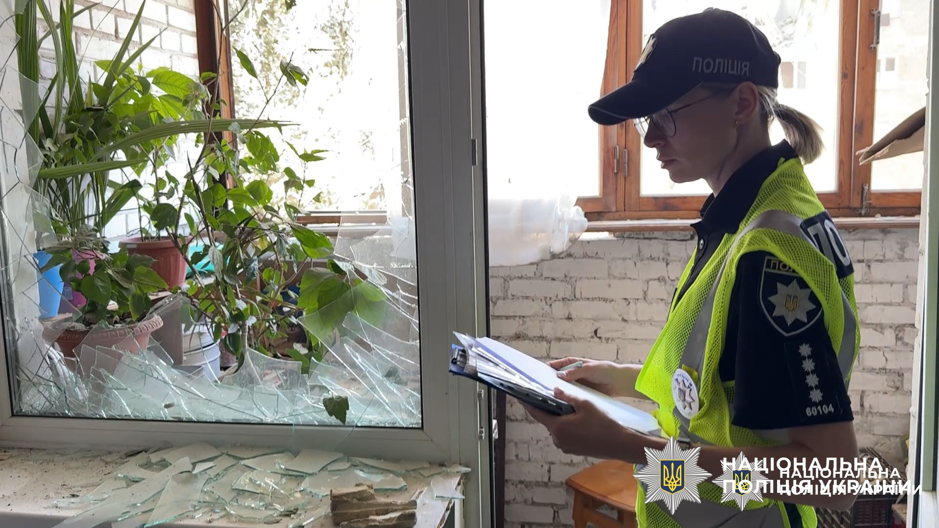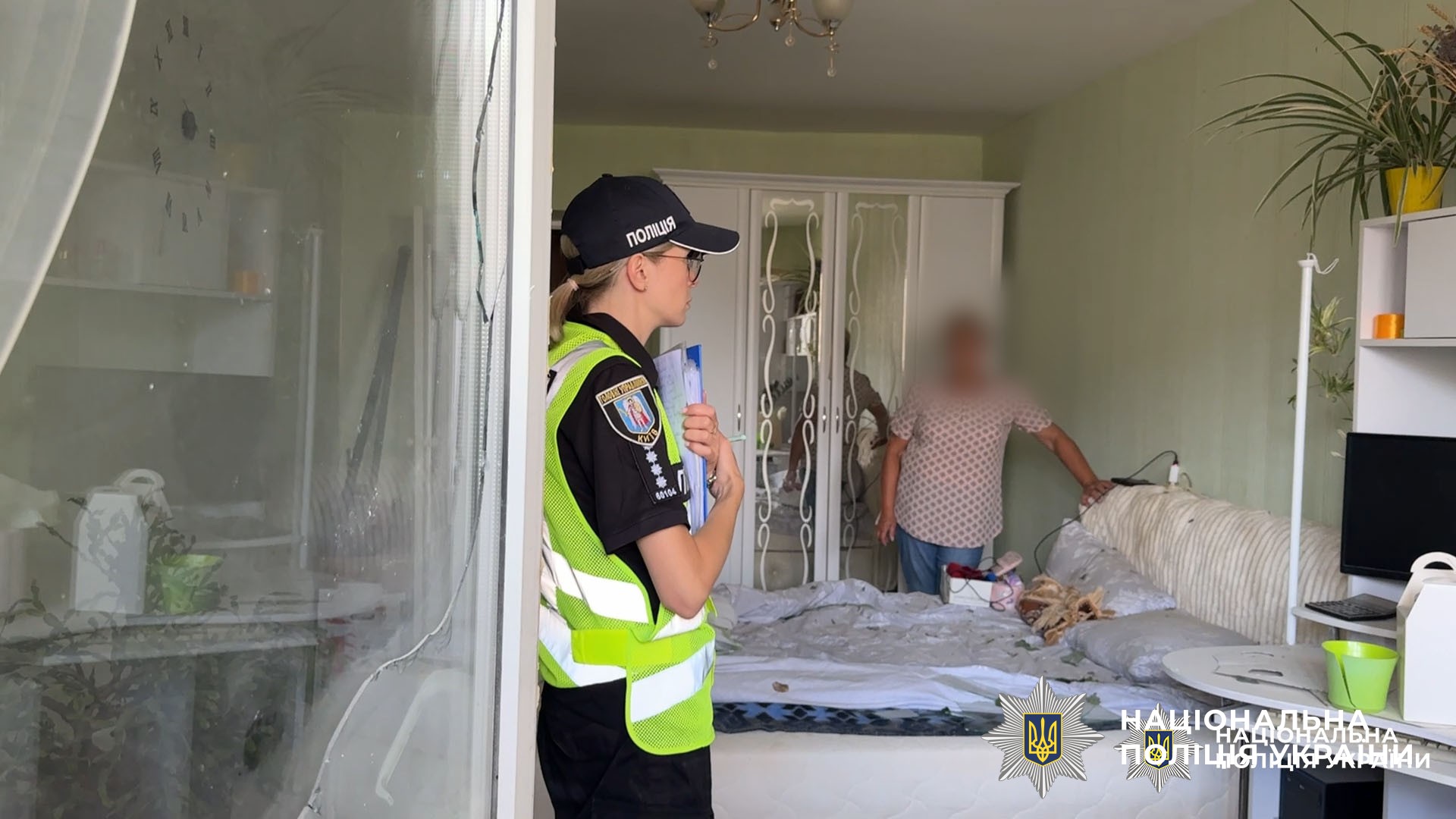 Правоохоронці спільно із постраждалими оглядають помешкання поруч із напівзруйнованою пʼятиповерхівкою та фіксують пошкодження.