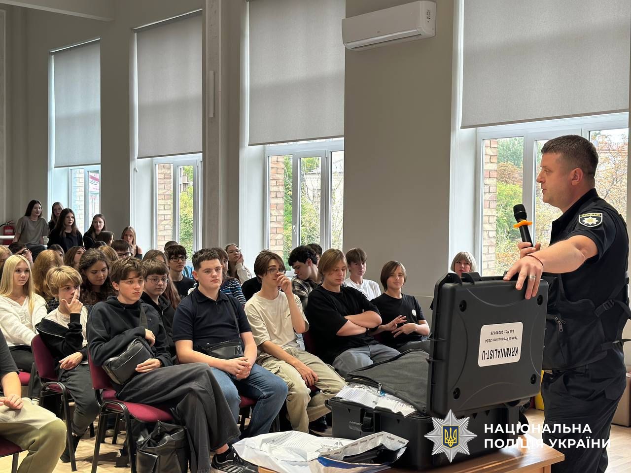 Молодь дізналася: що таке дактилоскопія і як за відбитками пальців встановлюють особу. Школярам було цікаво як виглядає валіза криміналіста та як за допомогою обладнання зафіксувати сліди взуття, рук, знарядь злочину. Спеціалісти розповіли як проводиться фотозйомка місця події, як працюють ультрафіолетові лампи, порошки для виявлення слідів, гіпсові зліпки. Школярі мали змогу власноруч зняти відбитки пальців, подивитися в мікроскоп і навіть уявити себе справжніми криміналістами.