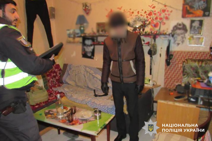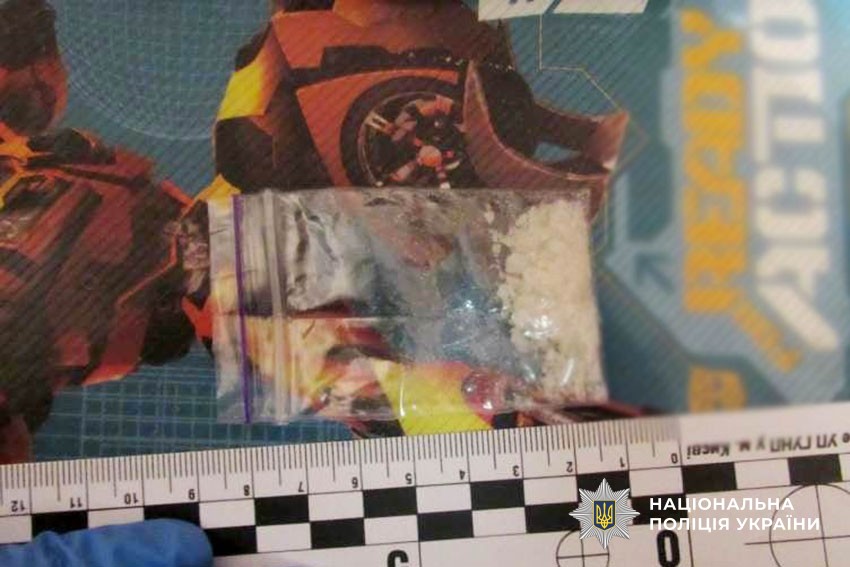 Слідчо-оперативна група територіального управління поліції провела поверхневу перевірку порушника, а також невідкладний обшук в його квартирі. У результаті поліцейські виявили в особистих речах чоловіка сім згортків із кристалоподібною речовиною білого кольору, схожою на психотропну речовину. Крім цього, в телефоні зловмисника знаходилися світлини із зображенням місць схованок та їхні координати, а в його оселі правоохоронці виявили два пакетика з наркотиками.