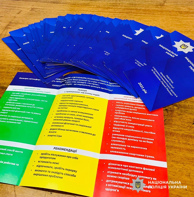 Продовжуємо розвивати Програму психологічної підтримки за принципом «Рівний-Рівному» в межах Канадсько-українського проєкту розвитку поліції CUPDP. Тож, працівникам поліції надано памʼятки з кольоровими сигналами «Світлофора психологічного здоров’я», які допомагають зрозуміти, коли ці реакції на стрес стають руйнівними та як діяти, коли ця реакція стає занадто «гострою».