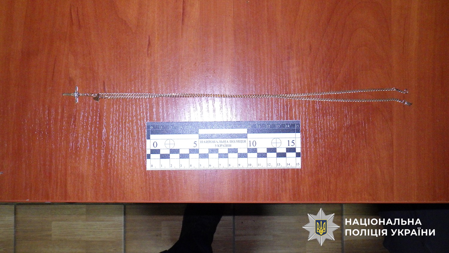 Зловмисник серед білого дня зірвав із жінки золотий ланцюжок із хрестиком, що був для неї родинною реліквією. Завдяки оперативним діям поліцейських підозрюваного встановили та затримали, а також вилучили вкрадену коштовність. Тепер йому загрожує до десяти років позбавлення волі.