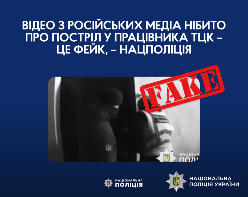 Інформуємо, що у ході попередньої перевірки із залученням співробітників підрозділу кримінального аналізу встановлено, що вказане відео містить ознаки підробки: на опублікованому фрагменті відеозапису не відображено характерних ознак, притаманних пострілу з вогнепальної зброї; написи на жилеті зображуваної особи нерозбірливі, імовірно, написані іноземними літерами, а працівники ТЦК СП при виконанні службових обов'язків ходять в камуфльованому одязі та без світловідбивних жилетів; «водяний знак» на відео – підробка під вотермарку НПУ, та не відповідає тій, якою маркується офіційне відео.