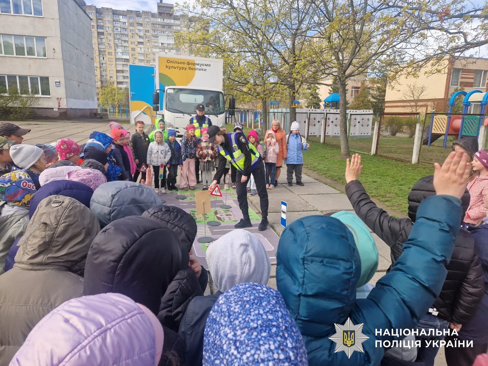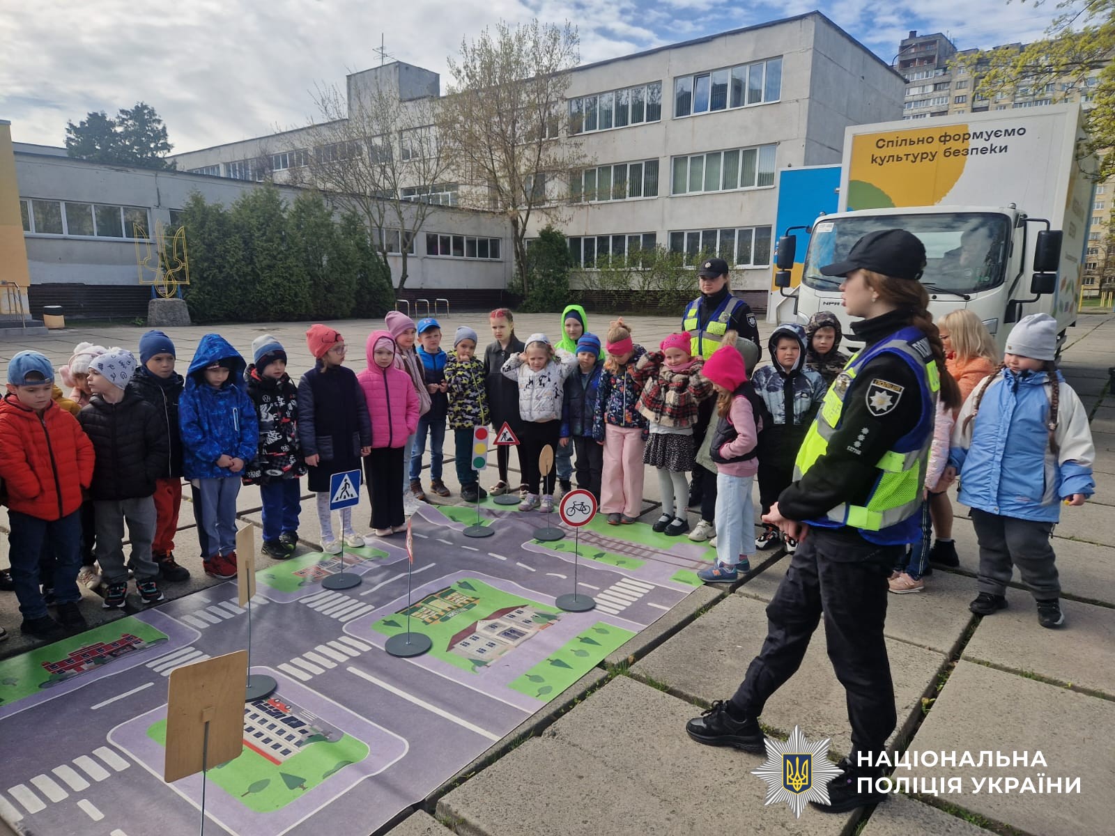 Окрему увагу поліцейські приділили правилам дорожнього руху та на подвір’ї освітнього закладу, за допомогою імпровізованої проїжджої частини нагадали як безпечно переходити дорогу використовуючи головні дорожні знаками.