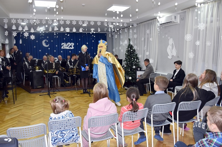 На початку заходу дітки гучними оплесками зустрічали поліцейський оркестр, який виконав декілька святкових музичний композицій. Потім на малечу чекав несподіваний сюрприз - зустріч із Святим Миколаєм. Діти з радістю зустріли казкового героя та захопливо слухали його вірші. Під музичний супровід оркестру малеча весело танцювала і раділа святу разом з поліцейськими та Миколаєм.