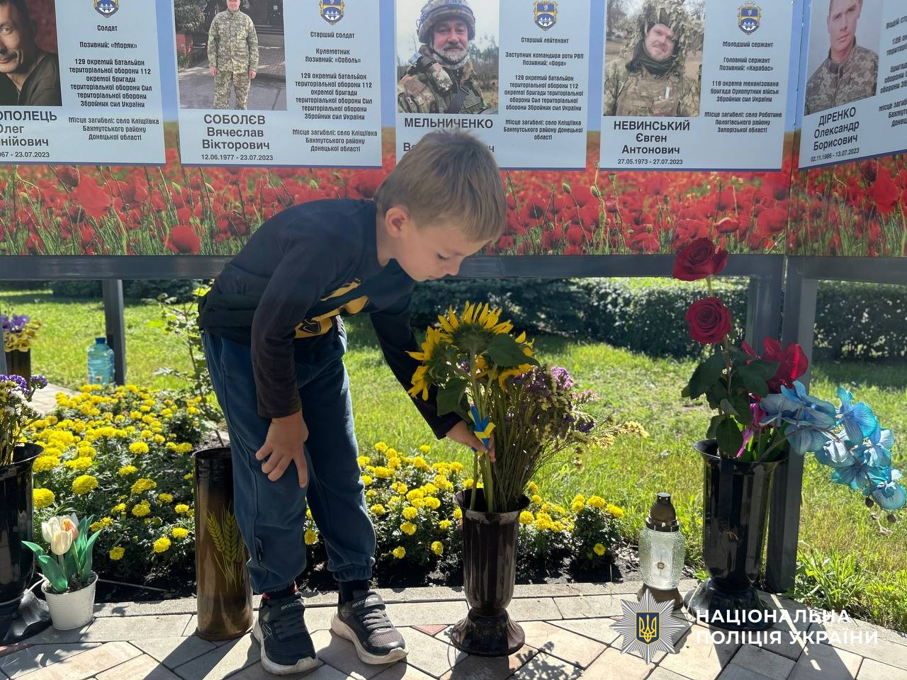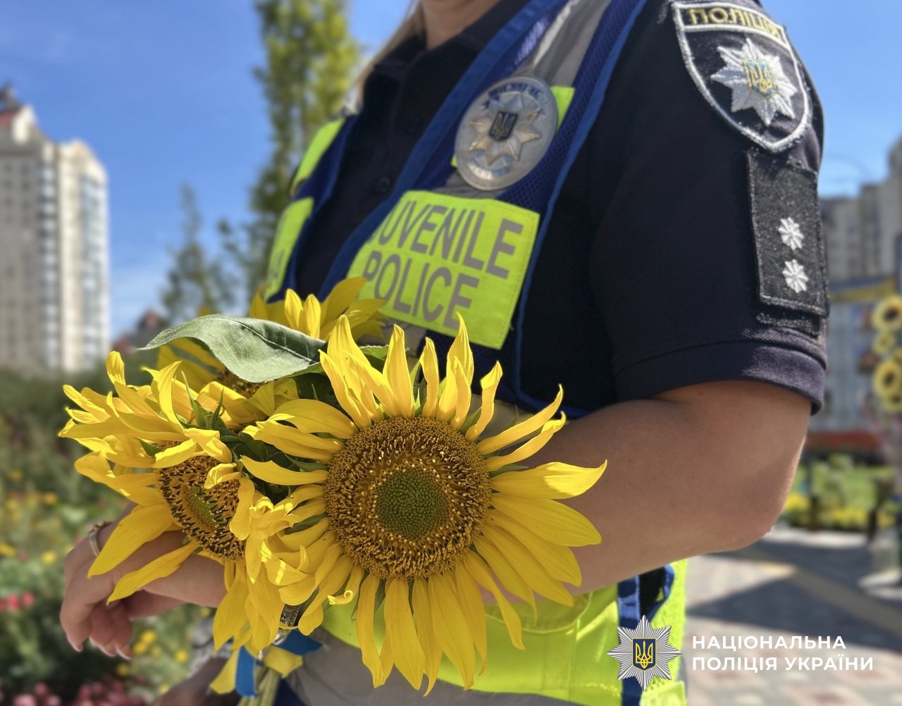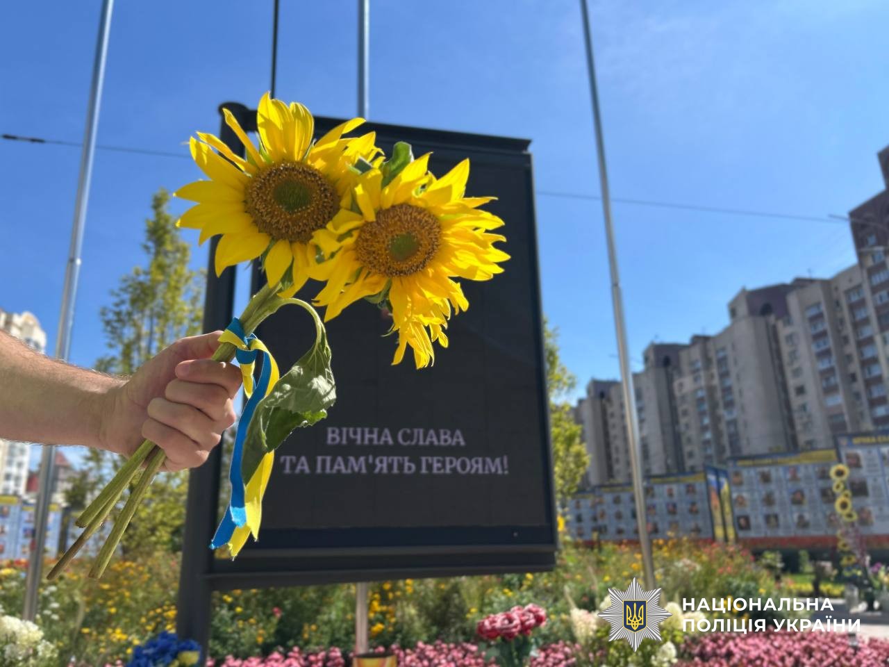 Символічно до Алеї пам’яті правоохоронці з маленькими киянами принесли соняхи – саме ці квіти нагадують нам про стійкість, незламність та силу духу українців.