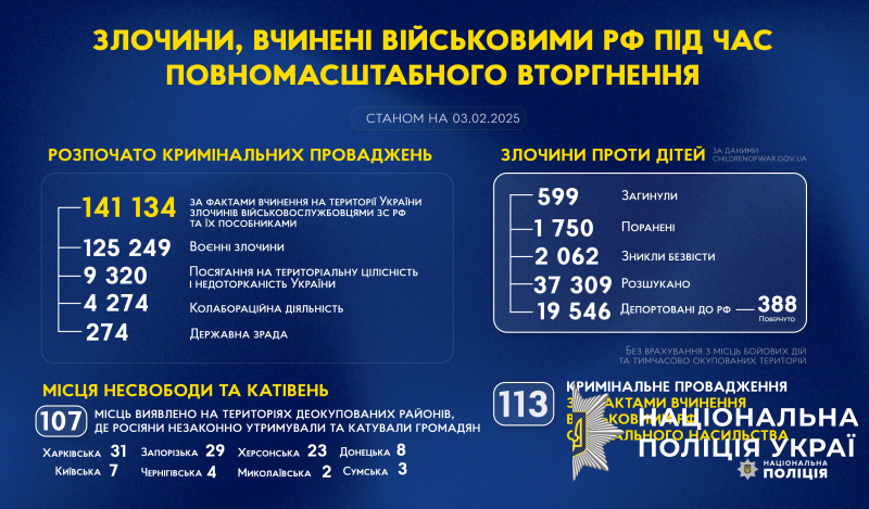 З початку повномасштабного вторгнення росії в Україну слідчі Національної поліції України розпочали 141 134 кримінальних проваджень за фактами вчинення на території України злочинів військовослужбовцями збройних сил російської федерації та їхніми пособниками.