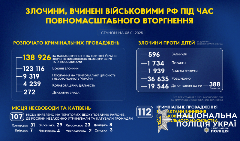 З початку повномасштабного вторгнення росії в Україну слідчі Національної поліції України розпочали 138 926 кримінальних проваджень за фактами вчинення на території України злочинів військовослужбовцями збройних сил російської федерації та їхніми пособниками.