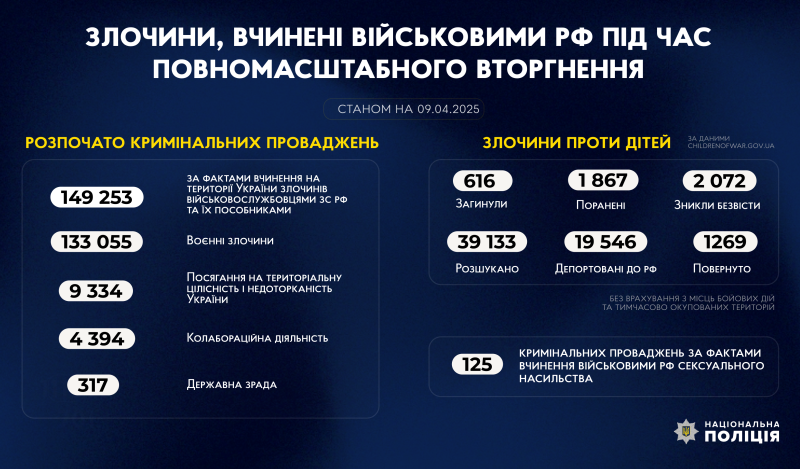 З початку повномасштабного вторгнення росії в Україну слідчі Національної поліції України розпочали 149 253 кримінальних проваджень за фактами вчинення на території України злочинів військовослужбовцями збройних сил російської федерації та їхніми пособниками.