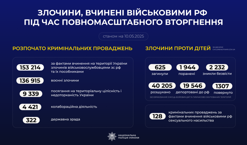З початку повномасштабного вторгнення росії в Україну слідчі Національної поліції України розпочали 153 214 кримінальних проваджень за фактами вчинення на території України злочинів військовослужбовцями збройних сил російської федерації та їхніми пособниками.