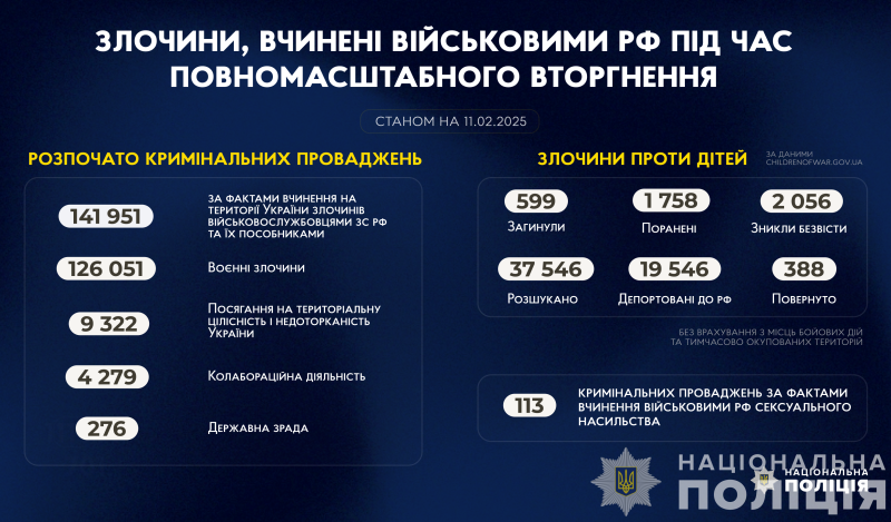 З початку повномасштабного вторгнення росії в Україну слідчі Національної поліції України розпочали 141 951 кримінальних проваджень за фактами вчинення на території України злочинів військовослужбовцями збройних сил російської федерації та їхніми пособниками.