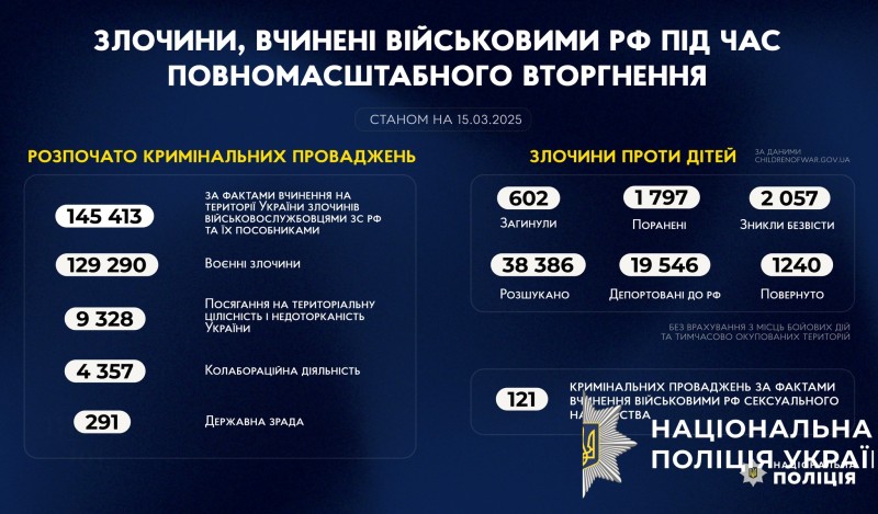 З початку повномасштабного вторгнення росії в Україну слідчі Національної поліції України розпочали 145 413 кримінальних проваджень за фактами вчинення на території України злочинів військовослужбовцями збройних сил російської федерації та їхніми пособниками.