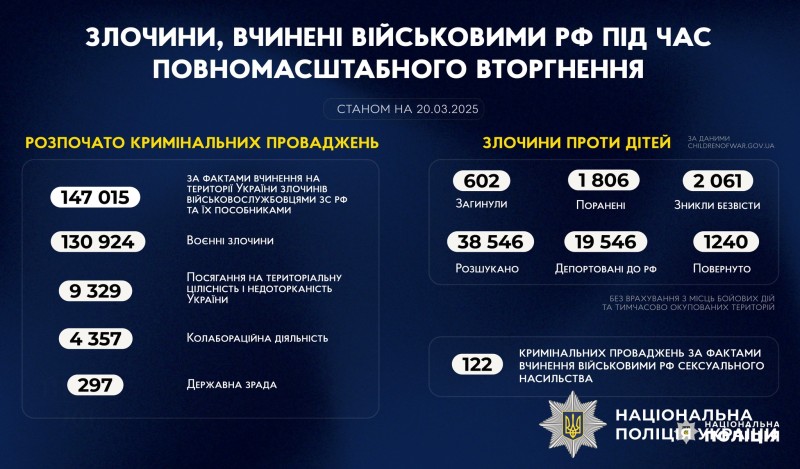 З початку повномасштабного вторгнення росії в Україну слідчі Національної поліції України розпочали 147 015 кримінальних проваджень за фактами вчинення на території України злочинів військовослужбовцями збройних сил російської федерації та їхніми пособниками.