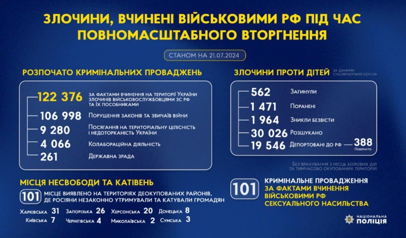 З початку повномасштабного вторгнення росії в Україну слідчі Національної поліції України розпочали 122 376 кримінальних проваджень за фактами вчинення на території України злочинів військовослужбовцями збройних сил російської федерації та їхніми пособниками.