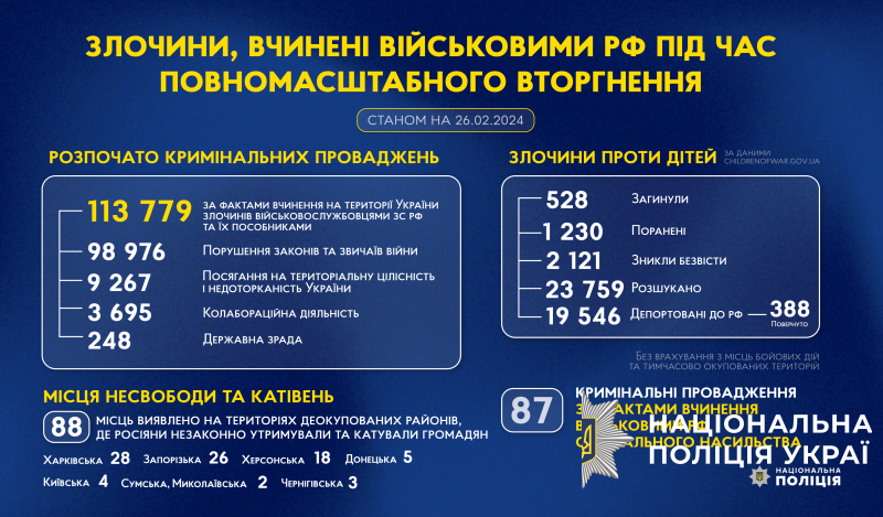 З початку повномасштабного вторгнення росії в Україну слідчі Національної поліції України розпочали 113 779 кримінальних проваджень за фактами вчинення на території України злочинів військовослужбовцями збройних сил російської федерації та їхніми пособниками.